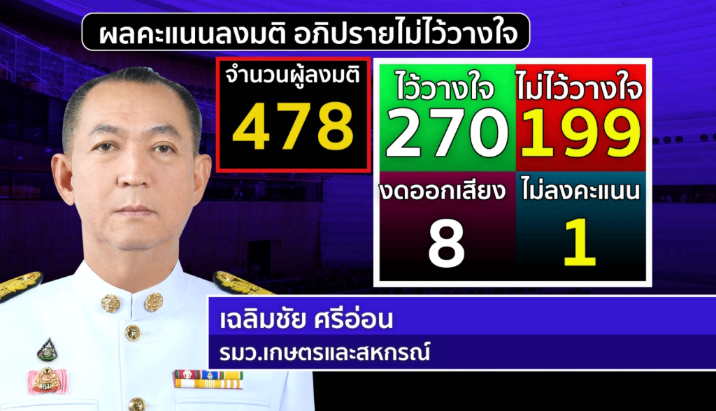 5. นายเฉลิมชัย ศรีอ่อน รัฐมนตรีว่าการกระทรวงเกษตรและสหกรณ์ มีคะแนนไว้วางใจ 270 เสียง ไม่ไว้วางใจ 199 เสียง งดออกเสียง 8 เสียง ไม่ลงคะแนน 1 เสียง
