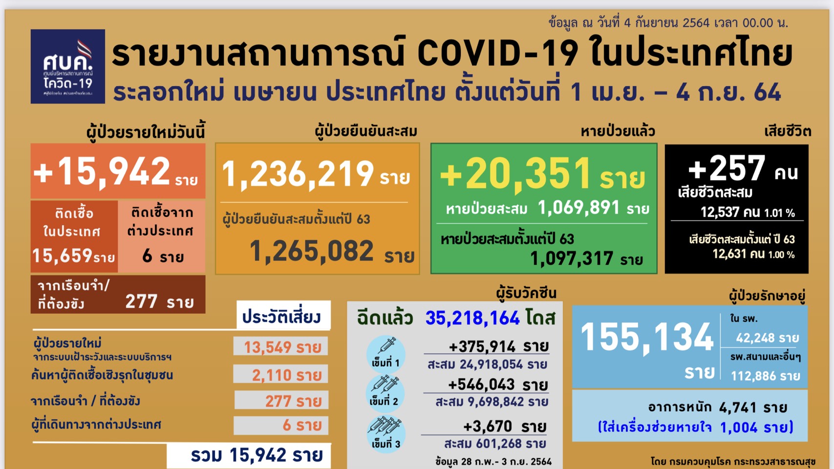 กรุงเทพฯ 4 ก.ย.-ศบค. เผยผู้ติดเชื้อโควิดรายใหม่ 15,942 ราย เสียชีวิต 257 ราย ในจำนวนนี้เป็นผู้มีอายุ 60 ปีขึ้นไป 181 ราย