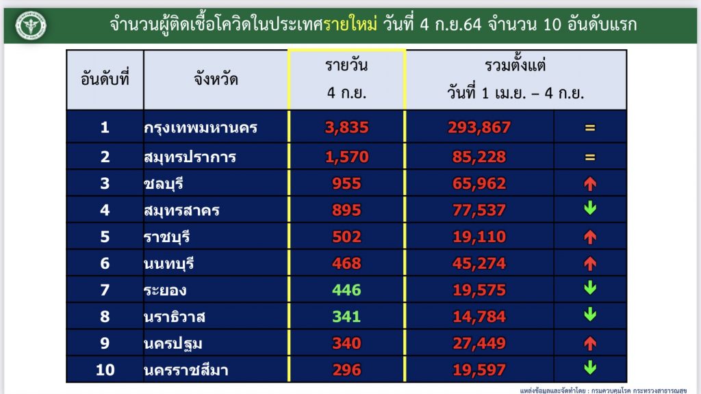 ผู้ติดเชื้อรายใหม่ มากที่สุด กทม. 3,835 ราย สมุทรปราการ 1,570 ราย ชลบุรี 955 ราย สมุทรสาคร 895 ราย ราชบุรี 502 ราย นนทบุรี 468 ราย ระยอง 446 ราย นราธิวาส 341 ราย นครปฐม 340 ราย และ นครราชสีมา 296 ราย