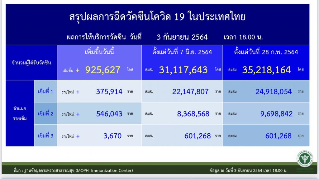 ส่วนการฉีดวัคซีน ฉีดเพิ่มขึ้น 925,627 โดส ทำให้ยอดรวมทั่วประเทศฉีดแล้ว 35,218,164 โดส เข็มที่หนึ่ง 24,918,054 โดส เข็มที่สอง 9,698,842 โดส และเข็มที่สาม 601,268 โดส
