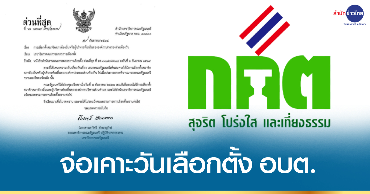 วันนี้ (8 ก.ย.) ผู้สื่อข่าวรายงานว่า หนังสือจากสำนักเลขาธิการคณะรัฐมนตรี ที่ลงนามโดย น.ส.สาวิตรี ชำนาญกิจ รองเลขาธิการคณะรัฐมนตรี ปฏิบัติราชการแทนเลขาธิการคณะรัฐมนตรี ในเรื่องการเลือกตั้งสมาชิกสภาท้องถิ่นหรือผู้บริหารท้องถิ่นขององค์กรปกครองส่วนท้องถิ่น ได้ส่งมาถึงสำนักงานคณะกรรมการการเลือกตั้งแล้ว เพื่อแจ้งให้ทราบว่า ที่ประชุมคณะรัฐมนตรี เมื่อวันที่ 7 กันยายน 2564 ลงมติเห็นชอบให้มีการเลือกตั้งสมาชิกสภาท้องถิ่นและผู้บริหารท้องถิ่นขององค์การบริหารส่วนตำบล และให้สำนักเลขาธิการคณะรัฐมนตรีแจ้งให้คณะกรรมการการเลือกตั้งทราบต่อไป