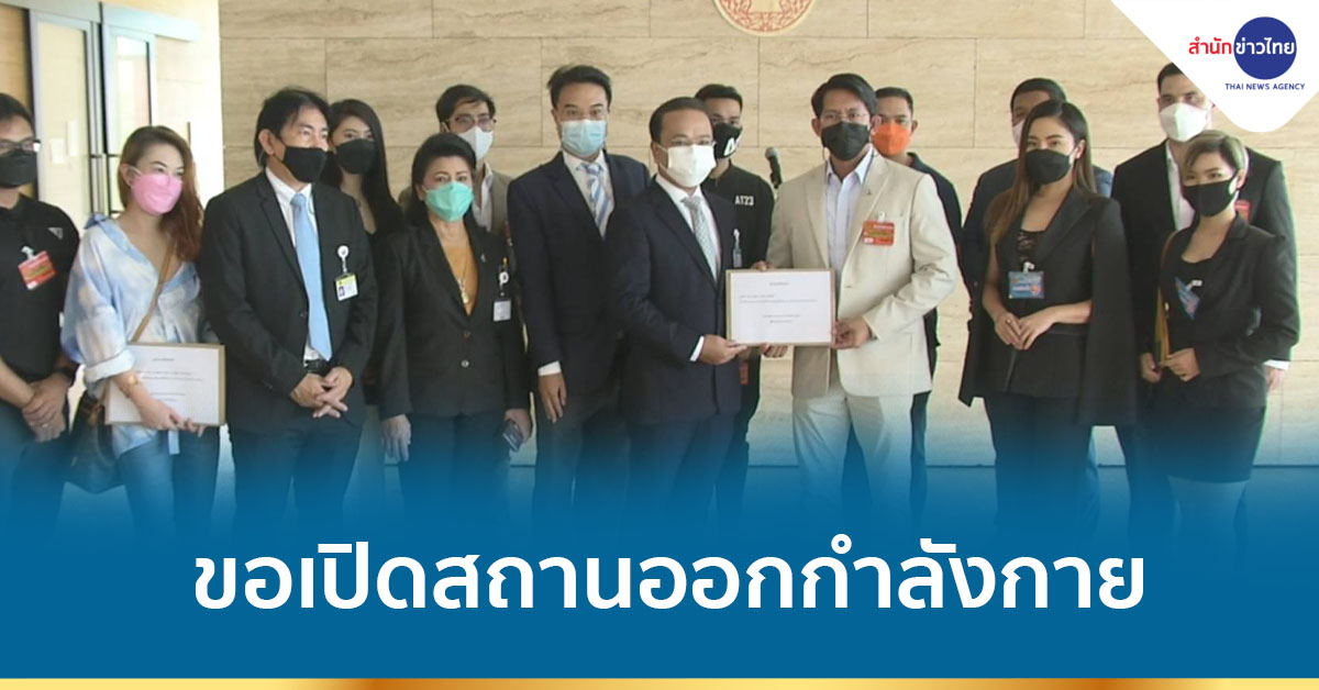 รัฐสภา 9 ก.ย.- ตัวแทนกลุ่มผู้ประกอบการฟิตเนส ยื่นหนังสือถึงประธานรัฐสภา เรียกร้องรัฐผ่อนปรนมาตรการให้สถานออกกำลังกาย กลับมาเปิดกิจการ