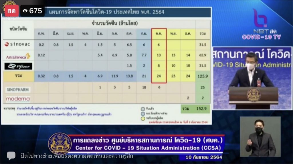 ทั้งนี้ที่ประชุม ศบค. ยังเห็นชอบแผนการจัดหาวัคซีนในประเทศไทย เดือนตุลาคม 2564 จำนวน 24 ล้านโดส แบ่งเป็น ซิโนแวค 6 ล้านโดส แอสตราเซเนกา 10 ล้านโดส ไฟเซอร์ 8 ล้านโดส และวางแผนถึงสิ้นปี 2564 รวม 152.9 ล้านโดส ในจำนวนนี้มีทั้งวัคซีนที่รัฐบาลจัดซี้อและวัคซีนที่ได้รับบริจาค โดยตั้งแต่วันที่ 27 ก.ย.-31 ต.ค.นี้ กลุ่มนักเรียนอายุระหว่าง 12-17 ปี ทั่วประเทศ จะได้รับวัคซีนไฟเซอร์ 2 เข็ม ห่างกัน 3-4 สัปดาห์ รวม 4.8 ล้านโดส และผู้ที่ได้รับวัคซีน ซิโนแวค ครบ 2 เข็มแล้ว ต้องการกระตุ้นเข็มที่ 3 จะได้รับวัคซีนแอสตราเซเนกา หรือไฟเซอร์ รวม 0.5 ล้านโดส โดยให้ฉีดในระยะ 1-3 เดือน หลังตรวจพบเชื้อและหายดี รวมทั้งพ้นระยะกักตัวแล้ว หรือฉีดวัคซีนเกิน 3 เดือนแล้ว.-สำนักข่าวไทย .