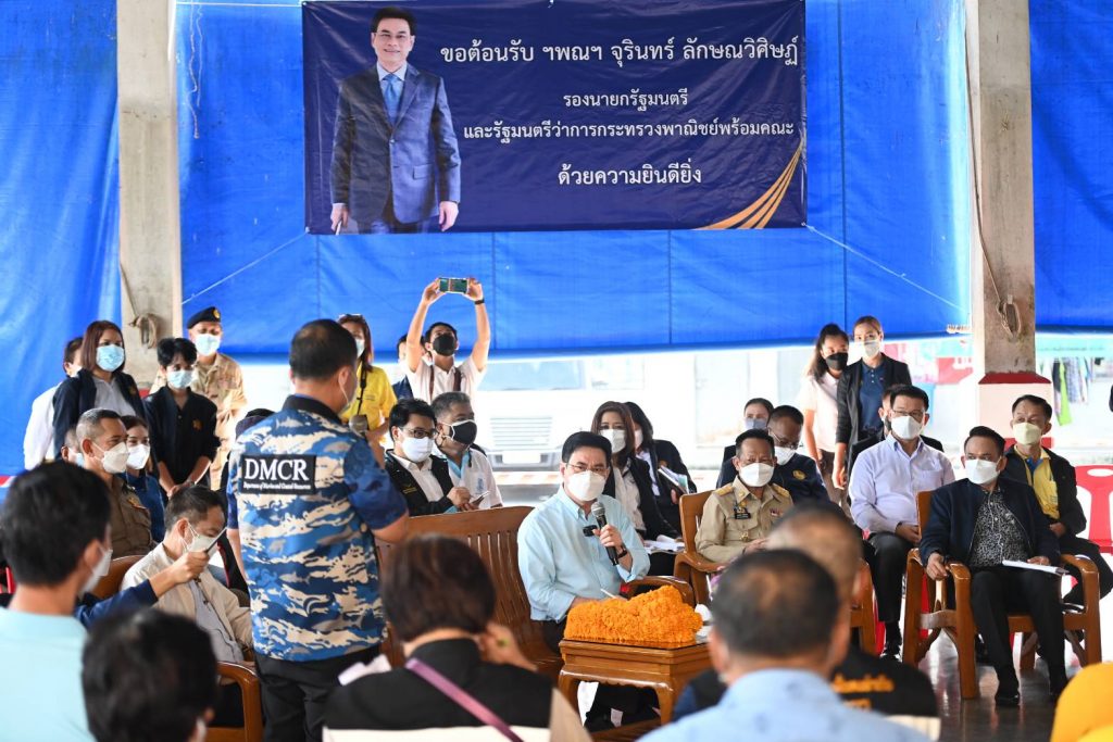 นายจุรินทร์ ลักษณวิศิษฏ์ หัวหน้าพรรคประชาธิปัตย์ รองนายกรัฐมนตรี และรัฐมนตรีว่าการกระทรวงพาณิชย์ พร้อมด้วยนายดนัยณัฏฐ์ โชคอำนวย คณะทำงานรัฐมนตรีว่าการกระทรวงเกษตรและสหกรณ์ ให้สัมภาษณ์ภายหลังติดตามการปฏิบัติราชการในพื้นที่เขตตรวจราชการสํานักนายกรัฐมนตรี (กลุ่มจังหวัดภาคใต้ฝั่งอันดามัน) หารือร่วมกับ ผู้ประกอบการแพปลาจังหวัดระนอง ณ แพปลากิจไพศาล ตําบล ปากน้ํา อําเภอเมือง จังหวัดระนอง