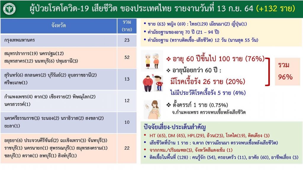 สำหรับผู้เสียชีวิตทั้ง 132 ราย ชาย 63 ราย หญิง 69 ราย เป็นชาวไทย 129 ราย เมียนมา 2 ราย ญี่ปุ่น 1 ราย อายุค่ากลาง 70 ปี อายุน้อยสุด 21 ปี อายุมากสุด 94 ปีแบ่งเป็น กทม. 23 ราย สมุทรปราการ 19 ราย นครปฐม สมุทรสาคร จังหวัดละ 12 ราย นนทบุรี สุรินทร์ พระนครศรีอยุธยา จังหวัดละ 6 ราย กำแพงเพชร 4 ราย ปทุมธานี ตาก นครศรีธรรมราช ฉะเชิงเทรา จันทบุรี จังหวัดละ 3 ราย สกลนคร บุรีรัมย์ อุบลราชธานี เชียงราย พิษณุโลก ระนอง นราธิวาส สงขลา จังหวัดละ 2 ราย ศรีสะเกษ นครสวรรค์ ยะลา ราชบุรี นครนายก สุพรรณบุรี สมุทรสงคราม ชลบุรี ตราด ลพบุรี สิงห์บุรี จังหวัดละ 1 ราย โรคประจำตัวยังเป็นปัจจัยเสี่ยงความดันโลหิตสูง เบาหวาน ไขมันในเลือดสูง พบผู้ป่วยอายุ 60 ปีขึ้นไป 100 ราย อายุน้อยกว่า 60 ปี มีโรคเรื้อรัง 26 ราย ไม่มีประวัติโรคเรื้อรัง 5 ราย ตั้งครรภ์ 1 ราย จ.กำแพงเพชร ตรวจพบเชื้อหลังเสียชีวิต เสียชีวิตที่บ้าน 1 ราย จ.ตาก (ชาวเมียนมา ตรวจพบเชื้อหลังเสียชีวิต) ปัจจัยเสี่ยงในการติดเชื้อจากคนรู้จัก คนในครอบครัวขณะที่ผู้เสียชีวิตส่วนใหญ่ร้อยละ 76 เป็นกลุ่มผู้สูงอายุ เกิน 60 ปี เป็นผู้ป่วยที่มีโรคเรื้อรัง ร้อยละ 20 และจะเพิ่มผู้ที่มีอายุ 50 ปีขึ้นไปที่ต้องเร่งฉีดวัคซีนด้วย