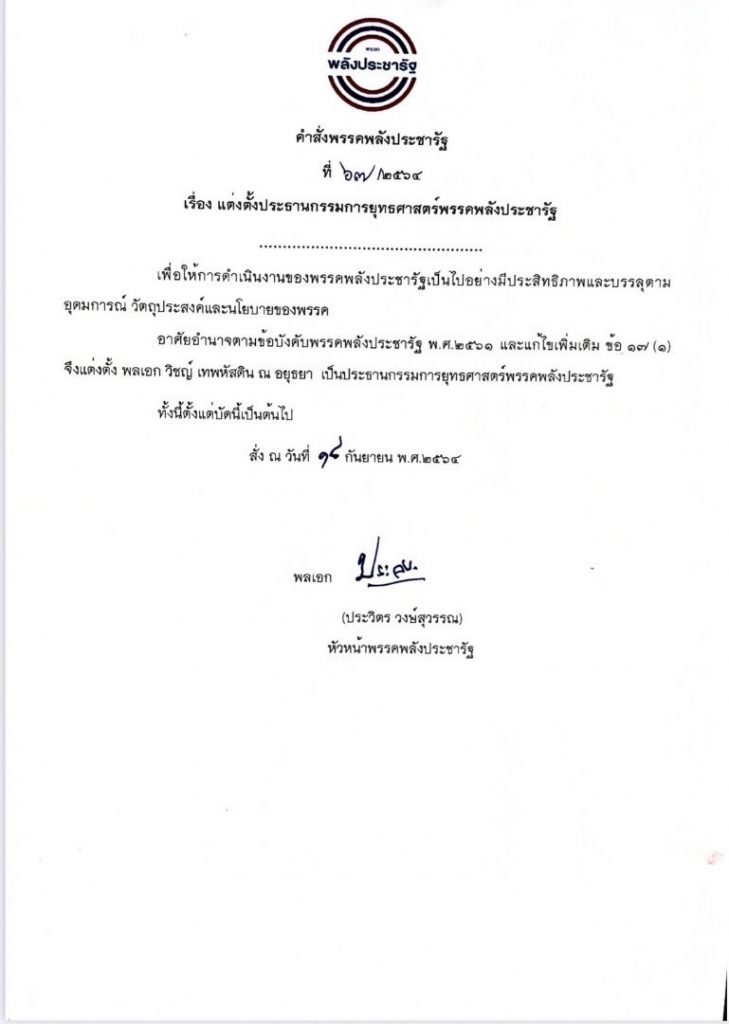 ผู้สื่อข่าวรายงานข่าวว่า มีเอกสารเผยแพร่คำสั่งของพรรคพลังประชารัฐ 67/2563 ลงนามโดย พล.อ.ประวิตร วงษ์สุวรรณ หัวหน้าพรรคพลังประชารัฐ โดยอาศัยอำนาจตามข้อบังคับพรรคพลังประชารัฐ แต่งตั้ง พล.อ.วิชญ์ เทพหัสดิน ณ อยุธยา เป็นประธานยุทธศาสตร์ของพรรค เพื่อให้การดำเนินงานของพรรคเป็นไปอย่างมีประสิทธิภาพ และ บรรลุตามอุดมการณ์ วัตถุประสงค์ และนโยบายของพรรค