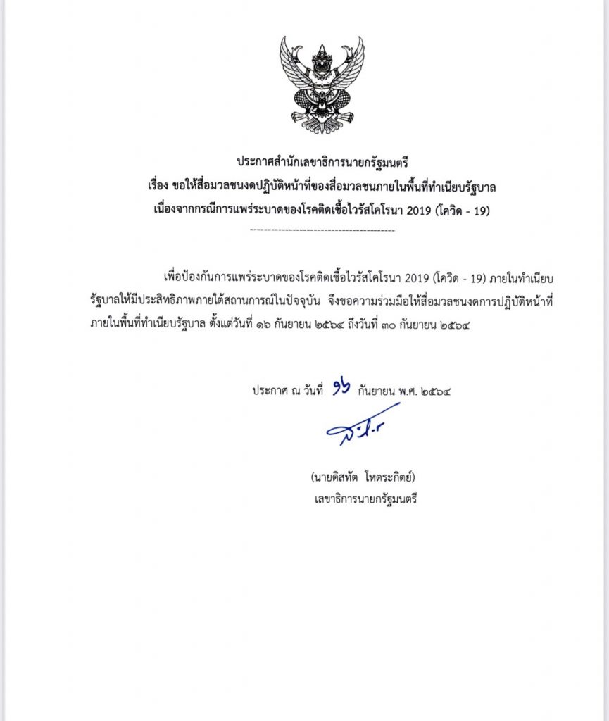 น.ส.นัทรียา ทวีวงศ์ ที่ปรึกษานายกรัฐมนตรี รักษาราชการตำแหน่งผู้อำนวยการสำนักโฆษก สำนักเลขาธิการนายกรัฐมนตรี แจ้งสื่อมวลชนว่า นายดิศทัต โหตระกิตย์ เลขาธิการนายกรัฐมนตรี ได้ออกประกาศสำนักเลขาธิการนายกรัฐมนตรี เรื่องขอให้สื่อมวลชนงดปฏิบัติหน้าที่ภายในพื้นที่ทำเนียบรัฐบาล เนื่องจากสถานการณ์การแพร่ระบาดของโรคโควิด-19 เพื่อป้องกันการแพร่ระบาดภายในทำเนียบรัฐบาล ให้มีประสิทธิภาพภายในสถานการณ์ปัจจุบัน จึงขอความร่วมมือให้สื่อมวลชนงดการปฏิบัติหน้าที่ภายในพื้นที่ทำเนียบรัฐบาล ตั้งแต่วันที่ 16-30 กันยายนนี้ .- สำนักข่าวไทย
