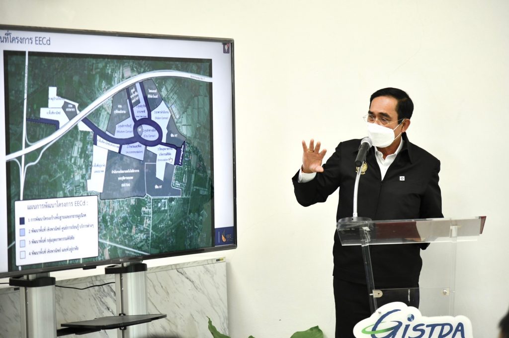 พลเอก ประยุทธ์ จันทร์โอชา นายกรัฐมนตรีและรัฐมนตรีว่าการกระทรวงกลาโหม ตรวจติดตามความก้าวหน้า สถานีดาวเทียมและศูนย์กลางขับเคลื่อนอุตสาหกรรมอวกาศ สํานักงานพัฒนาเทคโนโลยีอวกาศและภูมิสารสนเทศ (องค์การมหาชน) (GISTDA) โครงการอุทยานรังสรรค์นวัตกรรมอวกาศ (Space Krenovation Park: SKP) ในพื้นที่เขตส่งเสริมอุตสาหกรรมและนวัตกรรมดิจิทัล (Eastern Economic Corridor of Digital: EECd) เพื่อติดตามการวิจัยพัฒนาเทคโนโลยีขั้นสูง ได้แก่ ความคืบหน้าโครงการ THEOS-2 และการพัฒนาดาวเทียมระดับ Industrial grade โดยวิศวกรไทย ณ ศูนย์ทดสอบประกอบดาวเทียมแห่งชาติ , การพัฒนาเศรษฐกิจอวกาศ (New Space Economy) จากเครือข่ายดาวเทียมวงโคจรต่ำ (Low Earth Orbit: LEO satellite network) และการนําเทคโนโลยีอวกาศและภูมิสารสนเทศ ไปใช้ประโยชน์ด้านการบริหารจัดการน้ำ