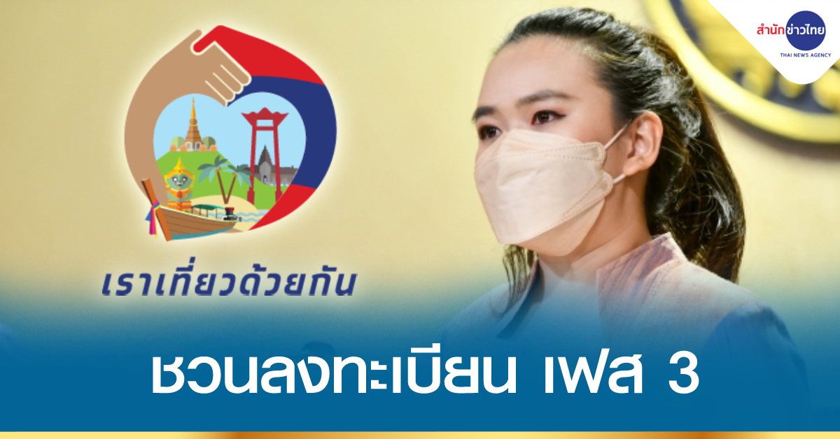 น.ส.ไตรศุลี ไตรสรณกุล รองโฆษกประจําสํานักนายกรัฐมนตรี กล่าวว่า รัฐบาลขอเชิญชวนประชาชนและผู้ประกอบการโรงแรม ร้านอาหาร การบริการท่องเที่ยว ลงทะเบียนเข้าร่วมโครงการ “เราเที่ยวด้วยกัน เฟส 3” ซึ่งเปิดให้ลงทะเบียนวันนี้ (24 ก.ย.) เป็นวันแรก โดยโครงการเราเที่ยวด้วยกัน เฟส 3 ให้สิทธิ 2 ล้านสิทธิ เพื่อสนับสนุนการท่องเที่ยวของประชาชน โดยรัฐบาลสนับสนุนค่าโรงแรม 40% ของราคาที่พัก/ห้อง/คืน ทั้งนี้ ไม่เกิน 3,000 บาท/ห้อง/คืน สูงสุดไม่เกิน 15 ห้อง หรือ 15 คืน, สนับสนุนคูปองอาหาร/ท่องเที่ยว มูลค่า 600 บาท/ห้อง/คืน ให้กับประชาชนเมื่อ check-in โรงแรมสำเร็จ โดยคูปองอาหาร/ท่องเที่ยว สามารถใช้ได้ที่ร้านอาหารและสถานที่ท่องเที่ยวที่ร่วมโครงการ โดยประชาชนชำระ 60% และรัฐบาลสนับสนุนอีก 40% ผ่านการตัดเงินจากคูปอง พร้อมทั้งยังสนับสนุนค่าตั๋วเครื่องบิน 40% ไม่เกิน 2,000 บาท หรือ 3,000 บาท ตามเงื่อนไขของจังหวัดด้วย