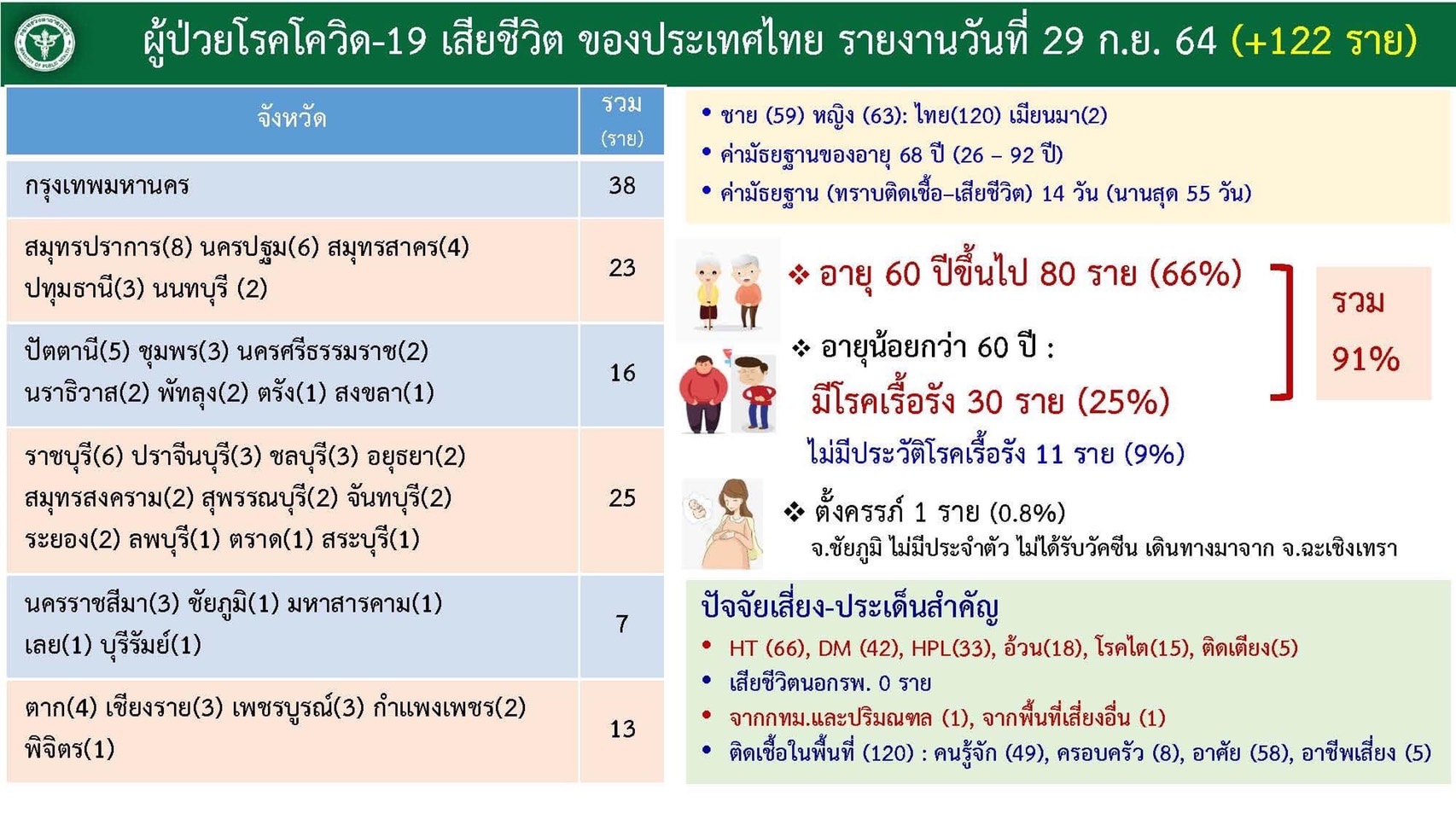พญ.อภิสมัย ศรีรังสรรค์ ผู้ช่วยโฆษกศูนย์บริหารสถานการณ์การแพร่ระบาดของโรคติดเชื้อไวรัสโคโรน่า 2019 (โควิด-19) หรือ ศบค. รายงานตัวเลขผู้ติดเชื้อโควิด 19 วันนี้ เพิ่มขึ้น 10,414 ราย ผู้ป่วยยืนยันสะสม 1,591,829 ราย หายป่วยเพิ่ม 11,589 ราย รวมหายป่วยแล้ว 1,459,786 ราย รักษาตัวอยู่ที่โรงพยาบาล 115,423 ราย เป็นผู้ป่วยอาการหนัก 3,232 ราย ใส่เครื่องช่วยหายใจ 729 ราย เสียชีวิตเพิ่ม 122 คน ผู้เสียชีวิตสะสมรวม 16,620 คน ผู้ป่วยยืนยันสะสมใหม่ ตั้งแต่วันที่ 1 เมษายน 2563 – 29 กันยายน 2564 จำนวน 1,562,966 ราย โดยผู้ติดเชื้อที่เพิ่มขึ้น 10,414 ราย เป็นผู้ที่ติดเชื้อในประเทศ 10,266 ราย จากระบบเฝ้าระวังและบริการ 9,044 ราย, จากการค้นหาเชิงรุกในชุมชน 1,182 ราย, จากเรือนจำ 170 ราย ติดเชื้อจากต่างประเทศ 10 ราย