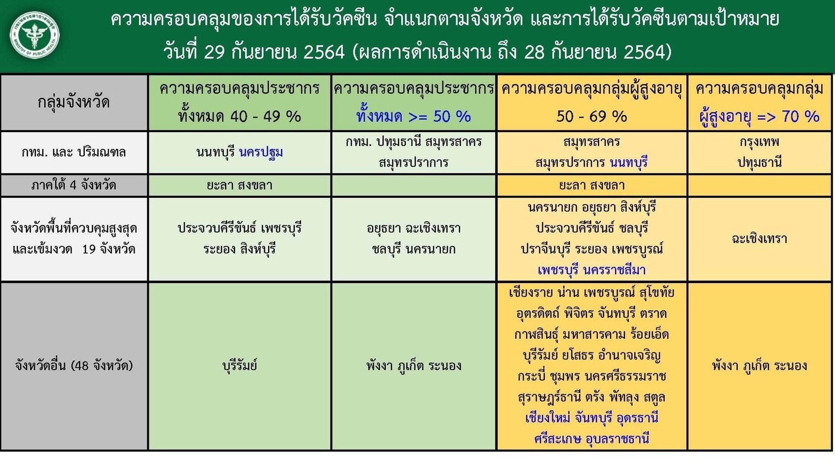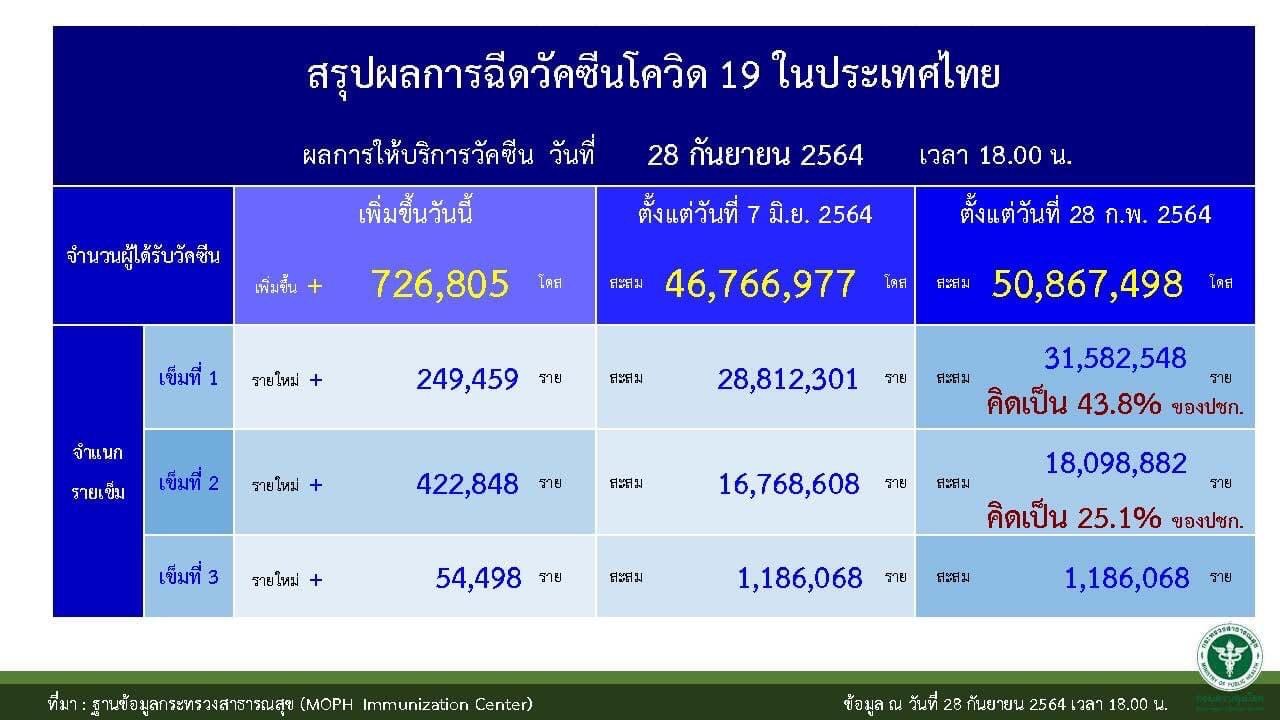 ผู้ช่วยโฆษกศบค. กล่าวว่า สำหรับยอดการฉีดวัคซีนทั่วประเทศ 50,867,498 โดส แบ่งเป็นเข็มที่ 1 จำนวน 31,582,548 ราย, เข็มที่ 2 จำนวน 18,098,882 ราย, เข็มที่ 3 จำนวน 1,186,068 ราย โดยจังหวัดที่ฉีดวัคซีนครอบคลุมประชากรกว่าร้อยละ 50 ได้แก่กรุงเทพฯ ปทุมธานี สมุทรสาคร สมุทรปราการ พระนครศรีอยุธยา ฉะเชิงเทรา ชลบุรีนครนายก พังงา ภูเก็ต และระนอง ส่วนจังหวัดที่ฉีดวัคซีนครอบคลุมกลุ่มผู้สูงอายุ เกินร้อยละ 70 ได้แก่ กรุงเทพฯ ปทุมธานี ฉะเชิงเทรา ภูเก็ต พังงา และระนอง