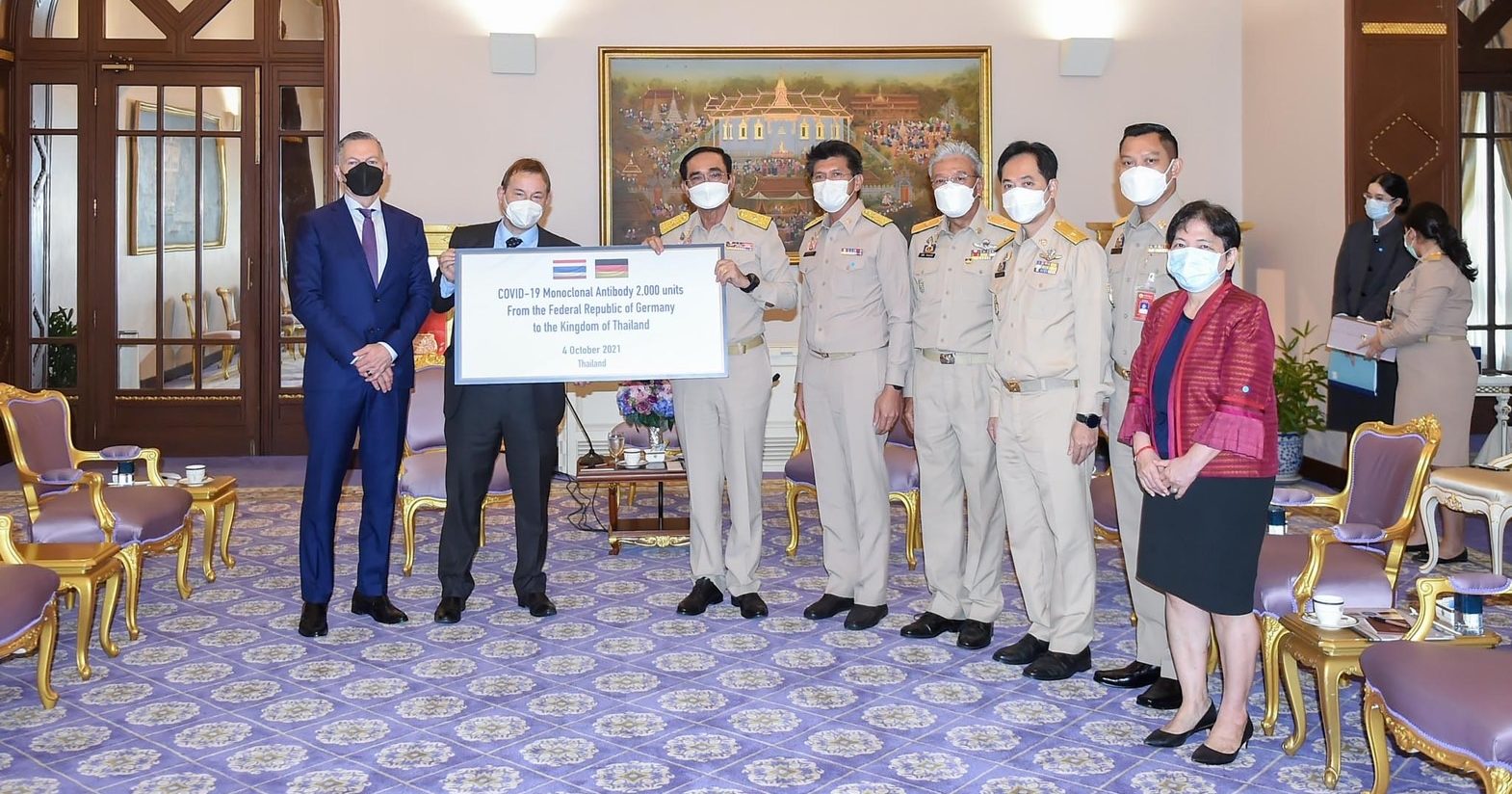พล.อ.ประยุทธ์ จันทร์โอชา นายกรัฐมนตรีและรัฐมนตรีว่าการกระทรวงกลาโหม รับมอบยารักษาโรคติดเชื้อไวรัสโคโรนา 2019 (โควิด-19) จากรัฐบาลสหพันธ์สาธารณรัฐเยอรมนี จำนวน 2,000 ยูนิต ผ่านนายเก-ออร์ค ชมิท (H.E. Mr. Georg Schmidt) เอกอัครราชทูตสหพันธ์สาธารณรัฐเยอรมนีประจำประเทศไทย เพื่อนำไปใช้ในการรักษาผู้ป่วยโควิด-19 กลุ่มอาการน้อยถึงปานกลาง ไม่ให้ผู้ป่วยมีอาการทรุดหนักลง นอกจากนี้ รัฐบาลสหพันธ์สาธารณรัฐเยอรมนีได้บริจาควัคซีนแอสตราเซเนกาให้ไทย จำนวน 346,100 โดส และอยู่ระหว่างเตรียมการขนส่ง คาดว่าจะถึงไทยในช่วงกลางเดือนตุลาคม 2564