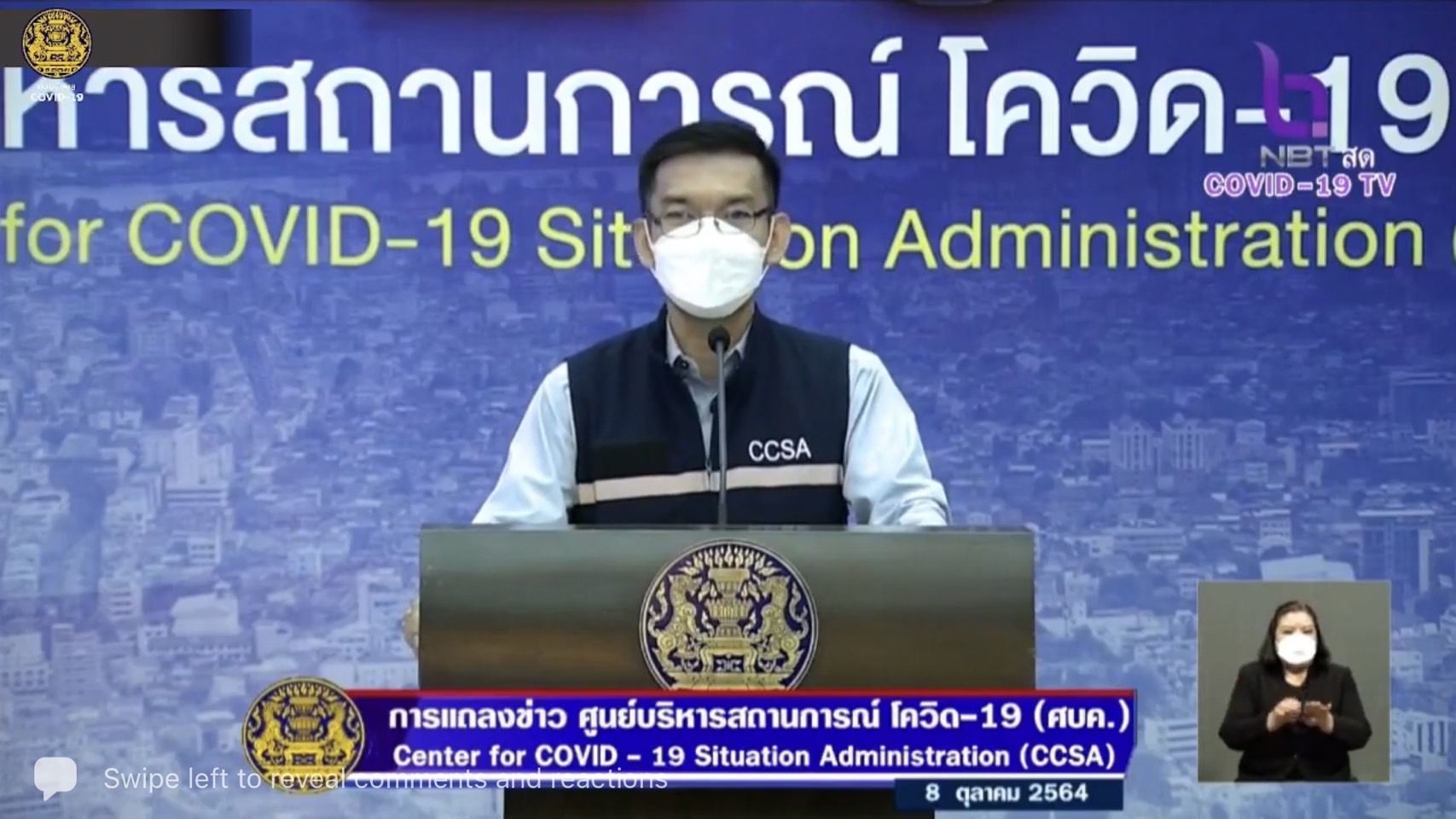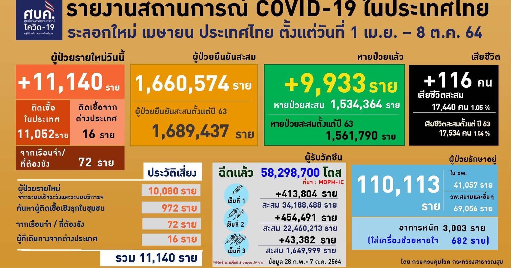 ทำเนียบรัฐบาล 8 ต.ค.-ศบค.เผยยอดติดเชื้อเพิ่ม 11,140 ราย เสียชีวิต 116 ราย อาการหนัก 3,003 ราย ใส่เครื่องช่วยหายใจ 682 ราย รักษาหายเพิ่ม 9,933 ราย ยันวัคซีน mRNA ไม่อันตรายตามที่มีกระแสในโซเชียล วอนอย่าหลงเชื่อ