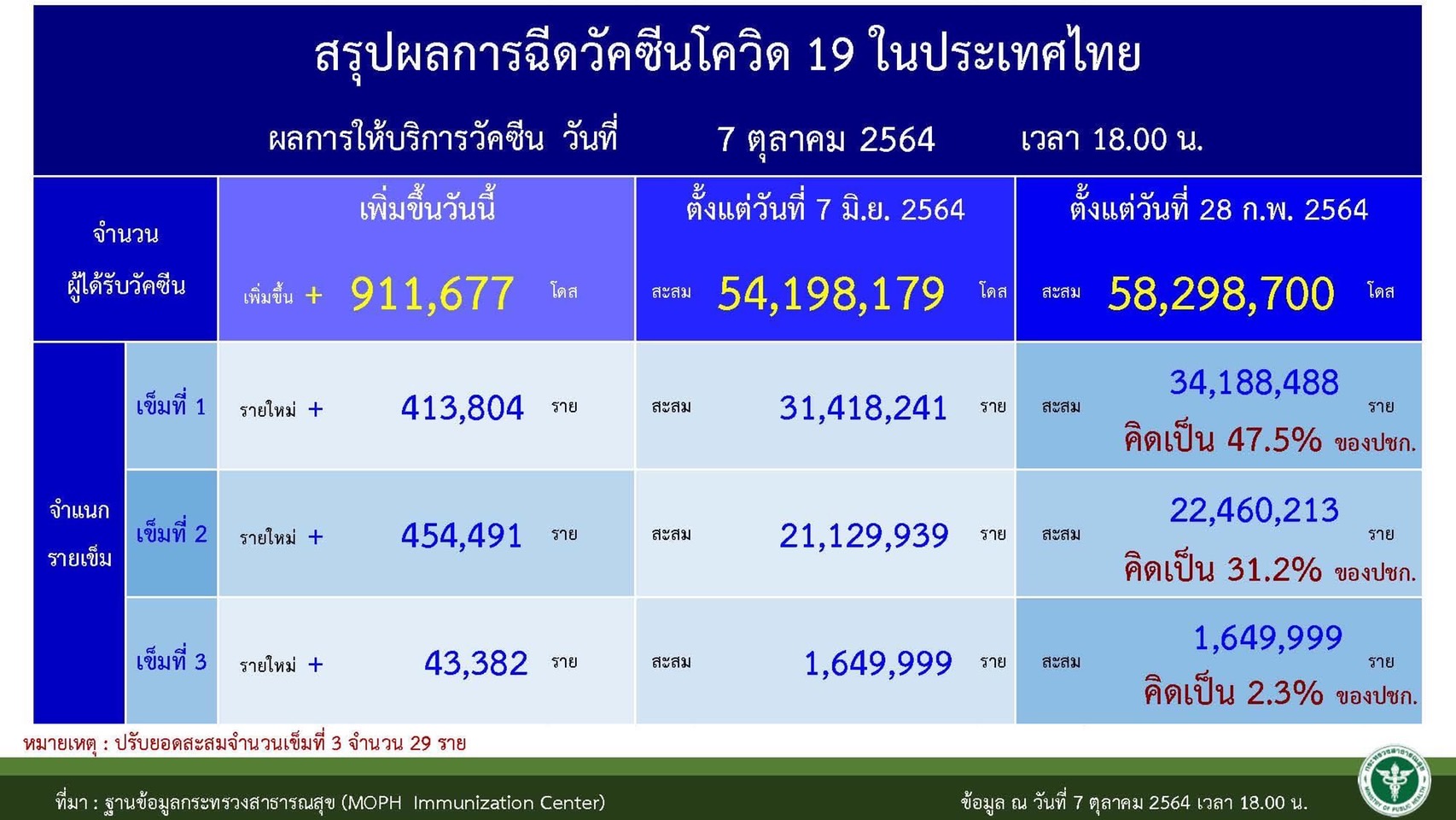 “สำหรับผู้ติดเชื้อรายจังหวัดมากที่สุด 10 จังหวัด ได้แก่ 1.กรุงเทพมหานคร ติดเชื้อ 1,255 ราย 2.ยะลา 776 ราย 3.ชลบุรี 687 ราย 4.สมุทรปราการ 576 ราย 5.สงขลา 444 ราย 6.ปัตตานี 503 ราย 7.สงขลา 444 ราย 8.นครศรีธรรมราช 395 ราย 9.ระยอง 342 ราย 10.จันทบุรี 284 ราย ขณะที่การรับวัคซีนโควิด-19 ระหว่างวันที่ 28 กุมภาพันธ์ – 7 ตุลาคม 2564 มีผู้รับวัคซีนสะสมทั้งหมด จำนวน 58,298,700 โดส