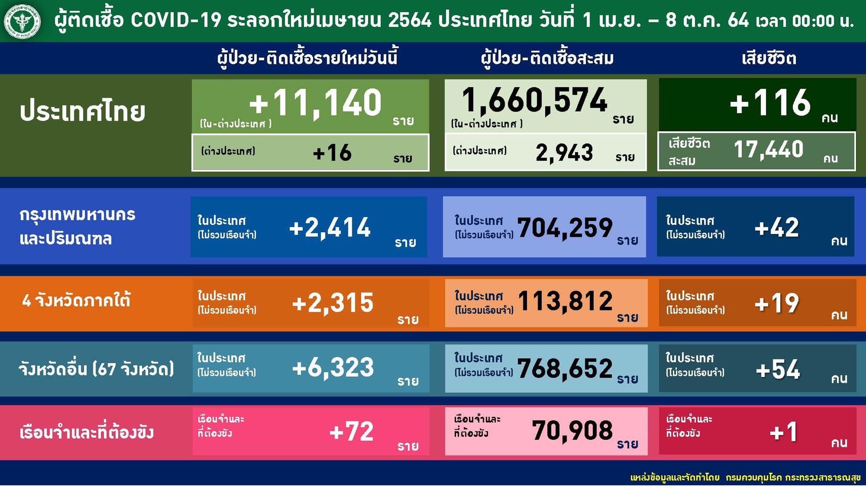 นพ.เฉวตสรร นามวาท ผู้อำนวยการกองควบคุมโรคและภัยสุขภาพในภาวะฉุกเฉิน กรมควบคุมโรคแถลงสถานการณ์การแพร่ระบาดของโรคโควิด-19 ในฐานะศูนย์บริหารสถานการณ์การแพร่ระบาดโรคติดเชื้อไวรัสโคโรนา 2019 (ศบค.) ว่า พบติดเชื้อเพิ่มในประเทศ 11,140 ราย แบ่งเป็นผู้ป่วยรายใหม่จากระบบเฝ้าระวังและระบบบริการ 10,080 ราย ค้นหาผู้ติดเชื้อเชิงรุกในชุมชน 972 ราย เรือนจำ/ที่ต้องขัง 72 ราย ผู้เดินทางมาจากต่างประเทศ 16 ราย รักษาหายเพิ่มขึ้น 9,933 ราย หายป่วยสะสม 1,551,857 ราย (ตั้งแต่ปี 2563) อยู่ระหว่างรักษาตัว 110,113 ราย แบ่งเป็นในโรงพยาบาล 41,057 ราย โรงพยาบาลสนามและอื่นๆ 69,056 ราย ในจำนวนนี้มีอาการหนัก 3,003 ราย ต้องใส่เครื่องช่วยหายใจ 682 ราย มีผู้เสียชีวิตเพิ่ม 116 ศพ ยอดผู้เสียชีวิตตั้งแต่ปี 2563 สะสม 17,534 ศพ
