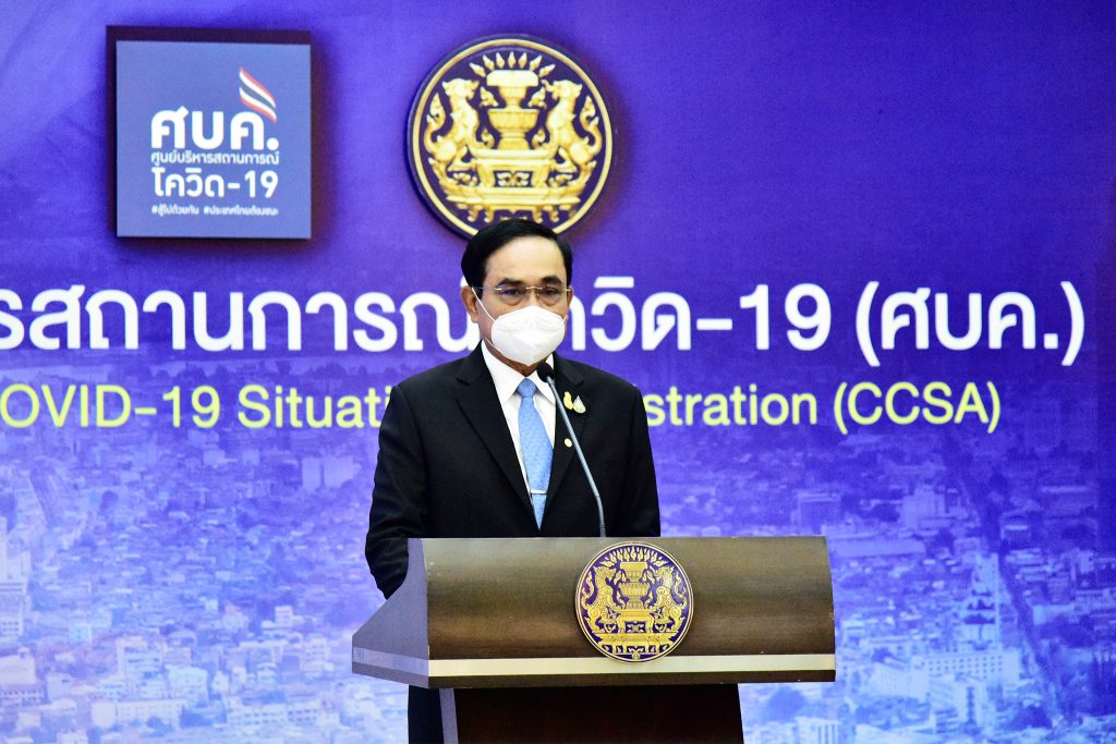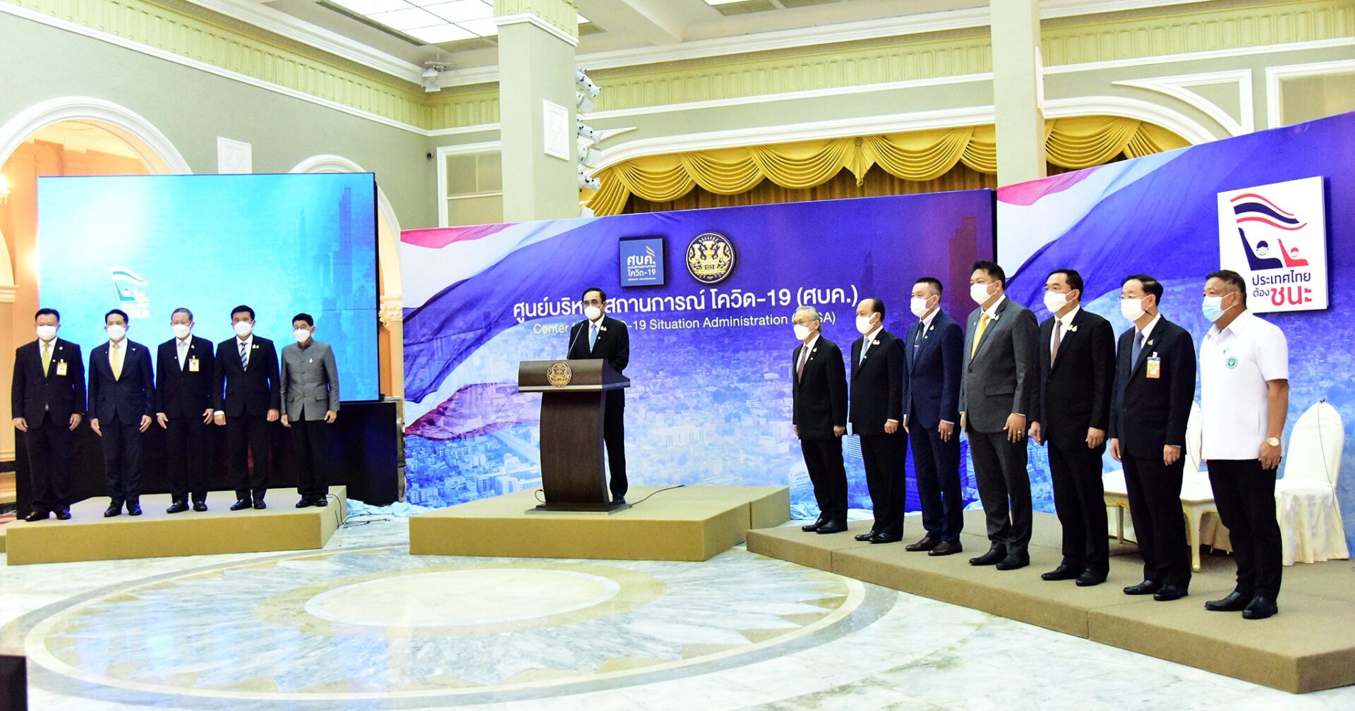 พลเอกประยุทธ์ จันทร์โอชา นายกรัฐมนตรี และรัฐมนตรีว่าการกระทรวงกลาโหม แถลงภายหลังการประชุม ศบค. โดยได้เรียกรัฐมนตรี และหัวหน้าส่วนราชการมาร่วมยืนแถลงข่าว ประกอบด้วย นายดอน ปรมัตถ์วินัย รองนายกรัฐมนตรีและรัฐมนตรีว่าการกระทรวงการต่างประเทศ นายวิษณุ เครืองาม รองนายกรัฐมนตรี นายอนุชา นาคาศัย รัฐมนตรีประจำสำนักนายกรัฐมนตรี พล.อ.อนุพงษ์เผ่าจินดา รัฐมนตรีว่าการกระทรวงมหาดไทย นายอาคม เติมพิทยาไพสิฐ รัฐมนตรีว่าการกระทรวงการคลัง นายศักดิ์สยาม ชิดชอบ รัฐมนตรีว่าการกระทรวงคมนาคม นายชัยวุฒิ ธนาคมานุสรณ์ รัฐมนตรีดิจิทัลเศรษฐกิจและสังคม นายสุชาติ ชมกลิ่น รัฐมนตรีว่าการกระทรวงแรงงาน ปลัดกระทรวงสาธารณสุข ประธานสภาหอการค้าฯ ประธานสภาอุตสาหกรรมฯ