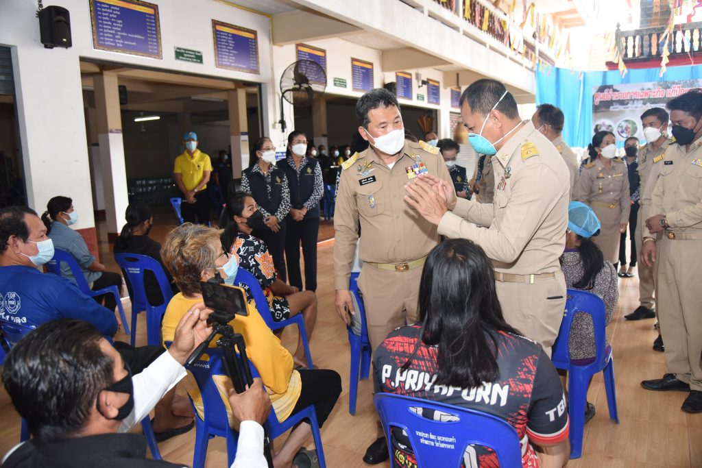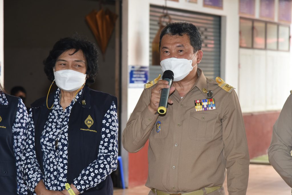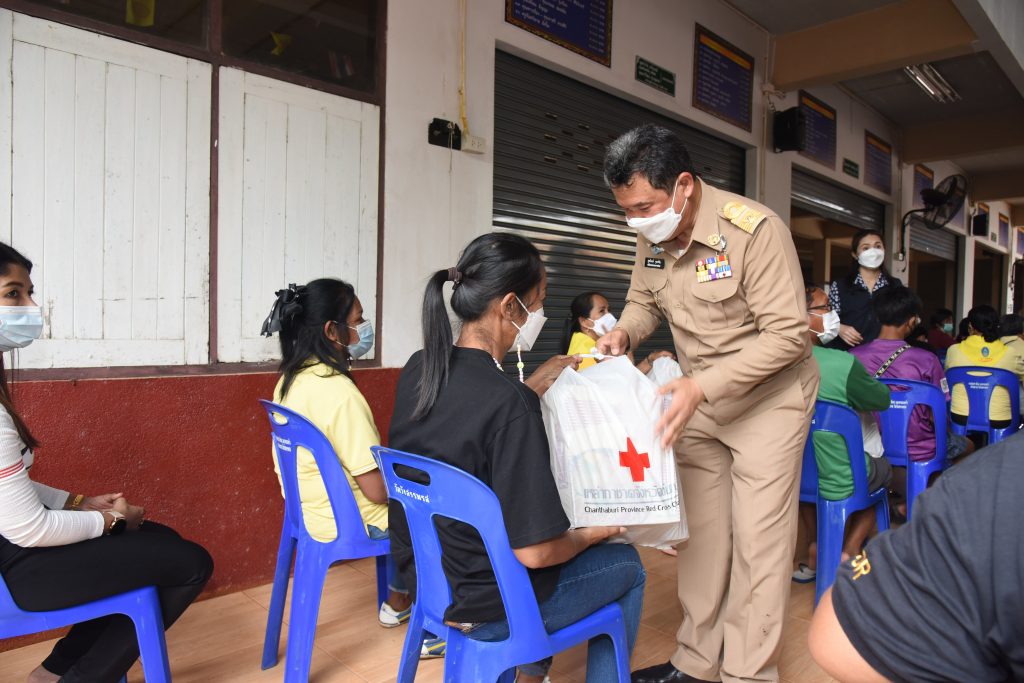 จากนั้น ในเวลา 12.15 น. ปลัดกระทรวงมหาดไทย และคณะ ได้เดินทางต่อไปมอบถุงยังชีพให้แก่ผู้แทนหมู่บ้าน/ชุมชน ในพื้นที่อำเภอเมืองจันทบุรี จำนวน 200 ชุด พร้อมพบปะให้กำลังใจพี่น้องประชาชนที่ประสบอุทกภัย โดยกล่าวว่า “ในขณะนี้ ขอให้พ่อแม่พี่น้องประชาชนทุกท่านอย่าได้ประมาท ช่วยกันติดตามข่าวพยากรณ์อากาศ รับฟังข้อมูลข่าวสารจากภาครัฐ ทั้งกำนัน ผู้ใหญ่บ้าน องค์กรปกครองส่วนท้องถิ่น ผ่านทางหอกระจายข่าว ทีวี และขณะเดียวกัน ต้องดูแลตนเองให้ปลอดภัยจากโรคภัยไข้เจ็บที่จะมากับน้ำท่วมและภัยจากอุบัติเหตุ เช่น ดื่มเหล้าจนเมาแล้ววูบจมน้ำ โรคไข้หวัด อุจจาระร่วง โรคผิวหนัง ไฟฟ้าช็อตเนื่องจากน้ำท่วมถึงบริเวณปลั๊กไฟ เป็นต้น ต้องระมัดระวังความปลอดภัยในชีวิตและทรัพย์สิน และรักษาสุขอนามัย สวมหน้ากากอนามัย เว้นระยะห่าง กินร้อน ช้อนกลาง ล้างมือ และช่วยกันรณรงค์ประชาสัมพันธ์ให้เพื่อนบ้านในชุมชน อย่าประมาท และหากต้องการขอรับความช่วยเหลือจากสถานการณ์อุทกภัย ให้ติดต่อสายด่วนนิรภัย 1784 หากเจ็บไข้ได้ป่วยกระทันหันหรือเจอคนประสบอุบัติเหตุ โทร. 1669 และหากมีเรื่องเดือดเนื้อร้อนใจ ถูกทวงหนี้ไม่เป็นไปตามกฎหมาย โทร. 1567 ศูนย์ดำรงธรรม เพื่อเจ้าหน้าที่เข้าให้ความช่วยเหลืออย่างทันท่วงที และขอเป็นกำลังใจให้กับพี่น้องประชาชนอีกครั้งหนึ่ง ขอให้ทุกท่านมีความสุข สุขภาพแข็งแรง คิดหวังสิ่งใดให้สมความปรารถนา รอดปลอดภัยจากภัยน้ำท่วมโดยเร็ววัน และต้องระลึกเสมอว่า “เราคนไทยไม่ทิ้งกัน เราคนไทยจะช่วยเหลือกัน เราคนไทยจะดูแลซึ่งกันและกัน” ตลอดไป