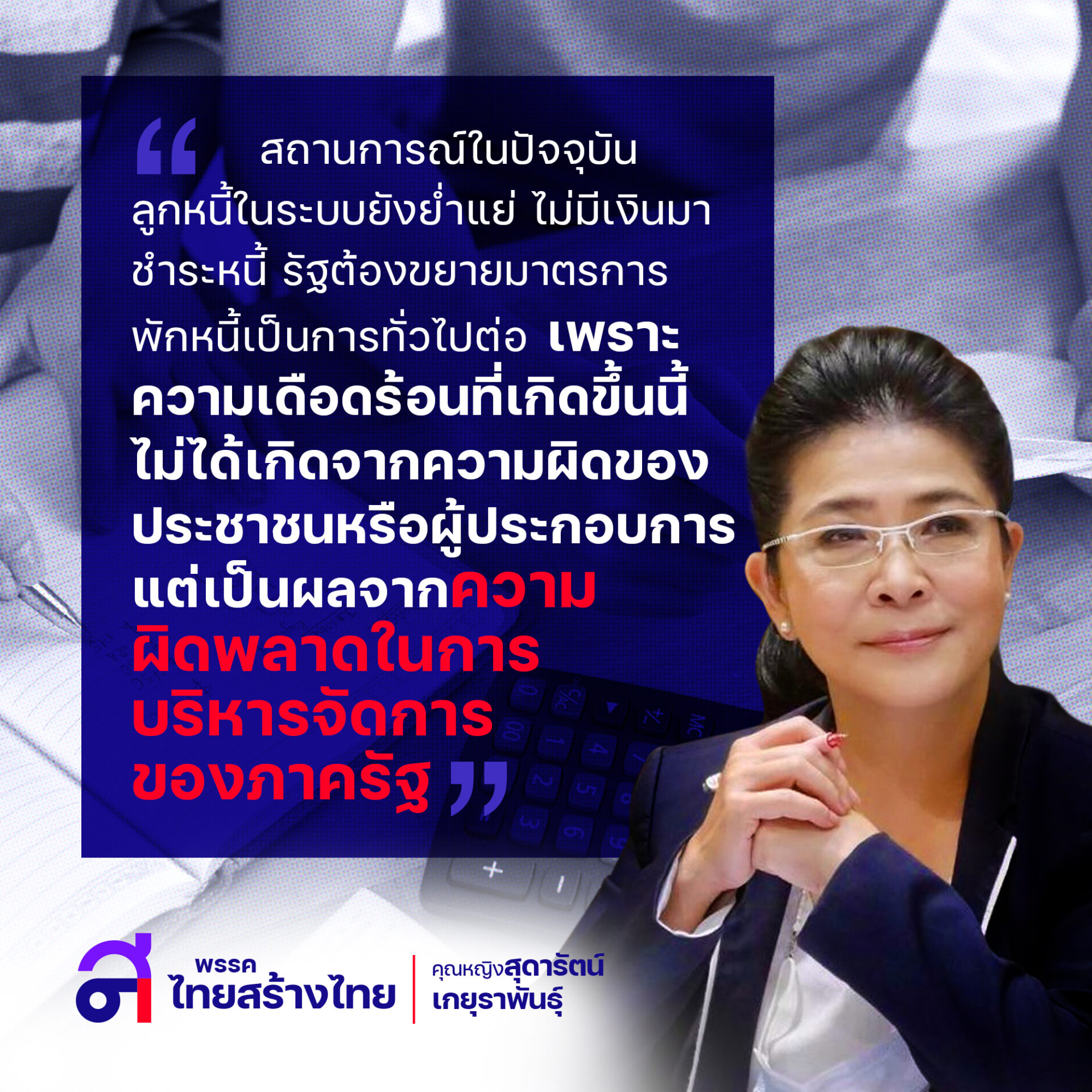 คุณหญิงสุดารัตน์ เกยุราพันธุ์ ประธานพรรคไทยสร้างไทย กล่าวว่าตามที่ทางภาครัฐได้มีการออกมาตรการพักชำระหนี้ โดยมีลูกหนี้ที่ขอรับความช่วยเหลือจากมาตรการดังกล่าวประมาณ 7 ล้านล้านบาท เป็นลูกหนี้ SME ประมาณ 1.35 ล้านล้านบาท ซึ่งมาตรการดังกล่าวใกล้จะครบกำหนดแล้ว
