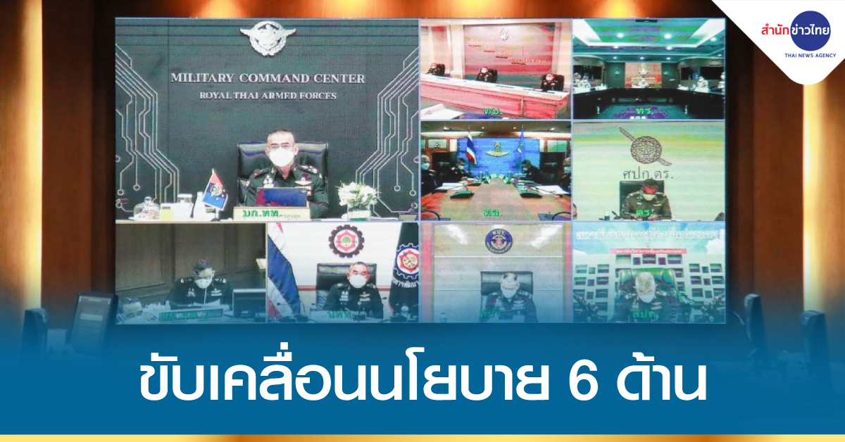 5. การเสริมสร้างความร่วมมือทางทหารกับต่างประเทศ ส่งเสริมร่วมมือและขยายความสัมพันธ์อันดีกับประเทศเพื่อนบ้าน มิตรประเทศ นานาชาติ รวมถึงองค์กรระหว่างประเทศ ด้วยความเป็นเอกภาพของกองทัพอย่างสมดุล ทั้งในระดับทวิภาคีและพหุภาคี เพื่อประโยชน์สูงสุดของประเทศโดยรวม และ 6. การบริหารจัดการ ปกครองผู้ใต้บังคับบัญชาด้วยความเป็นธรรม ยึดมั่นตามสายการบังคับบัญชา เพื่อความเป็นปึกแผ่นของกองทัพไทย และดูแลผู้ใต้บังคับบัญชาอย่างทั่วถึงและต่อเนื่อง ใช้แนวทางการบริหารกิจการบ้านเมืองที่ดี และหลักธรรมาภิบาล ให้เป็นที่เชื่อมั่นศรัทธาของประชาชน.-สำนักข่าวไทย