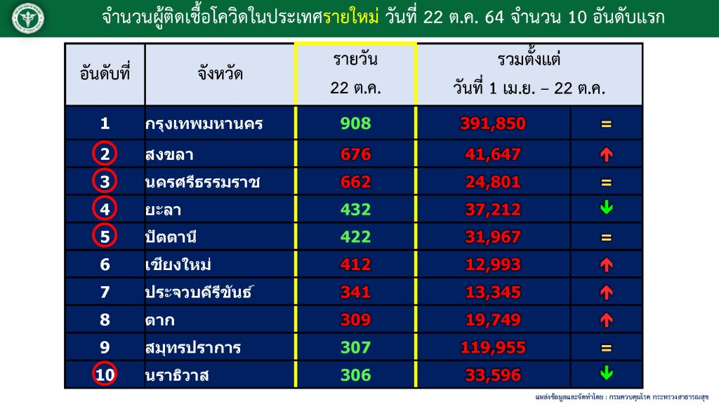 จังหวัดที่มีรายงานผู้ติดเชื้อรายใหม่สูงสุด 10 อันดับแรก ได้แก่ กรุงเทพมหานคร 908 ราย, สงขลา 676 ราย, นครศรีธรรมราช 662 ราย, ยะลา 432 ราย, ปัตตานี 422 ราย, เชียงใหม่ 412 ราย, ประจวบคีรีขันธ์ 341 ราย, ตาก 309 ราย, สมุทรปราการ 307 ราย และนราธิวาส 306 ราย โดยประเทศไทยมีผู้ติดเชื้อสะสมอยู่ในอันดับที่ 24.-สำนักข่าวไทย