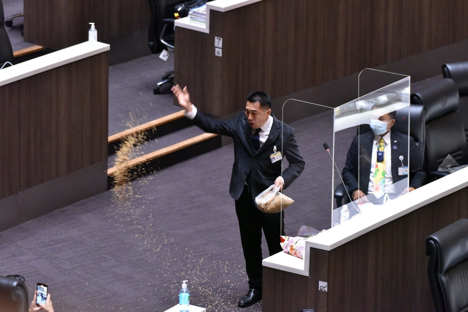 จากนั้น นายพิเชษฐ์ ได้นำข้าวเปลือกและข้าวสารหว่านกลางห้องประชุมสภาฯ ทันที เพื่อเป็นการแสดงเชิงสัญลักษณ์ว่าวันนี้เกษตรกรไม่รู้จะพึ่งใครแล้ว ทำให้นายชวน กล่าวกับนายพิเชษฐ์ ว่า เห็นใจ แต่ขอให้นายพิเชษฐ์คำนึงถึงความสะอาดด้วย วันนี้เราเปิดโอกาสให้แสดงความรู้สึก และเชื่อว่าชาวบ้านไม่ต้องการให้เรามาทำแบบนี้ นายพิเชษฐ์ จึงตอบนายชวนว่า “เดี๋ยวผมจะเก็บทุกเม็ดครับ”