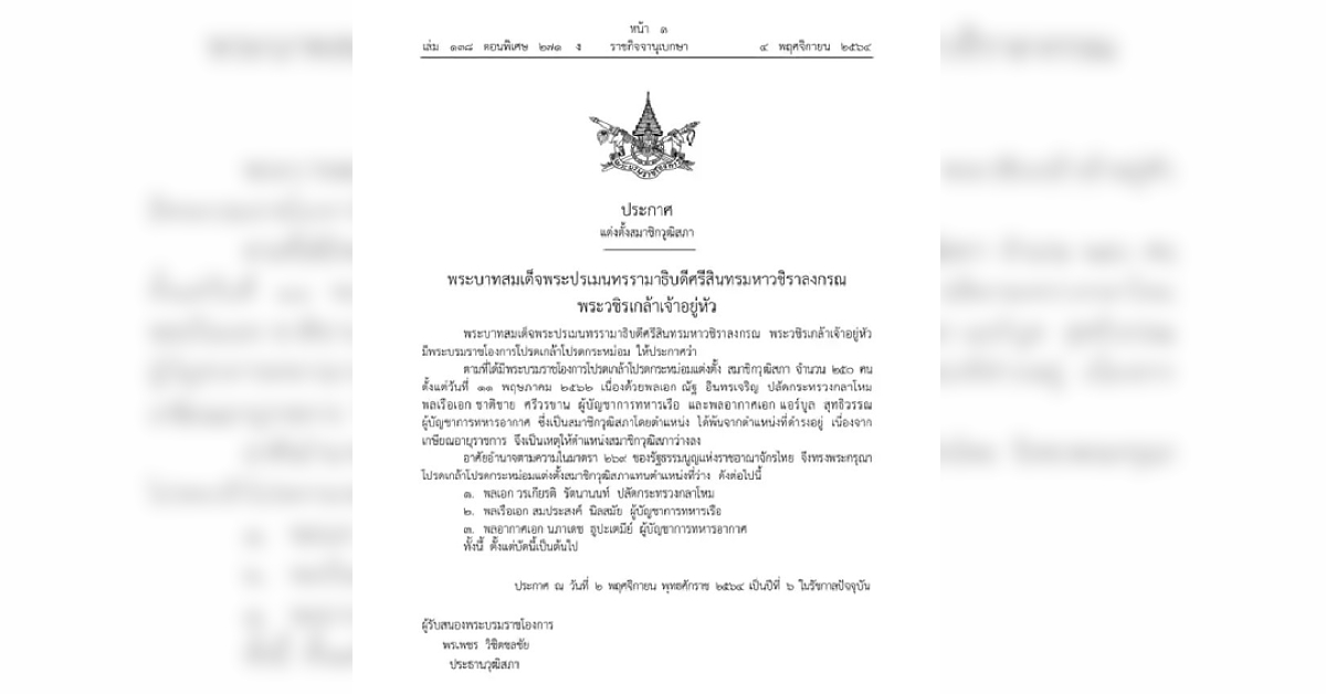กรุงเทพฯ 4 พ.ย. – ราชกิจจานุเบกษา เผยพระบรมราชโองการโปรดเกล้าฯ แต่งตั้งปลัดกระทรวงกลาโหม ผู้บัญชาการทหารเรือ และผู้บัญชาการทหารอากาศ เป็นสมาชิกวุฒิสภา แทนผู้เกษียณอายุราชการ พร้อมรายงานตัวก่อนประชุม 8 พ.ย.นี้