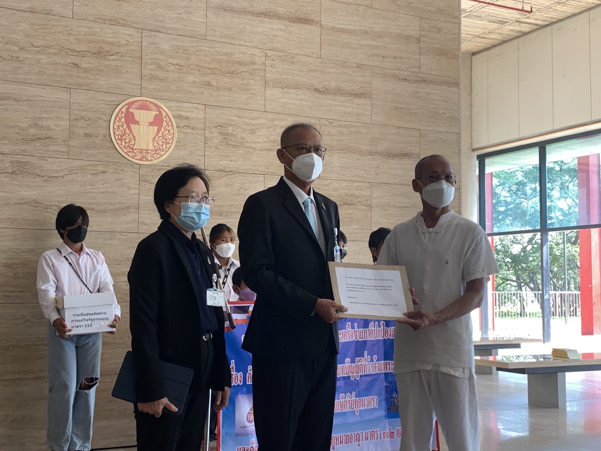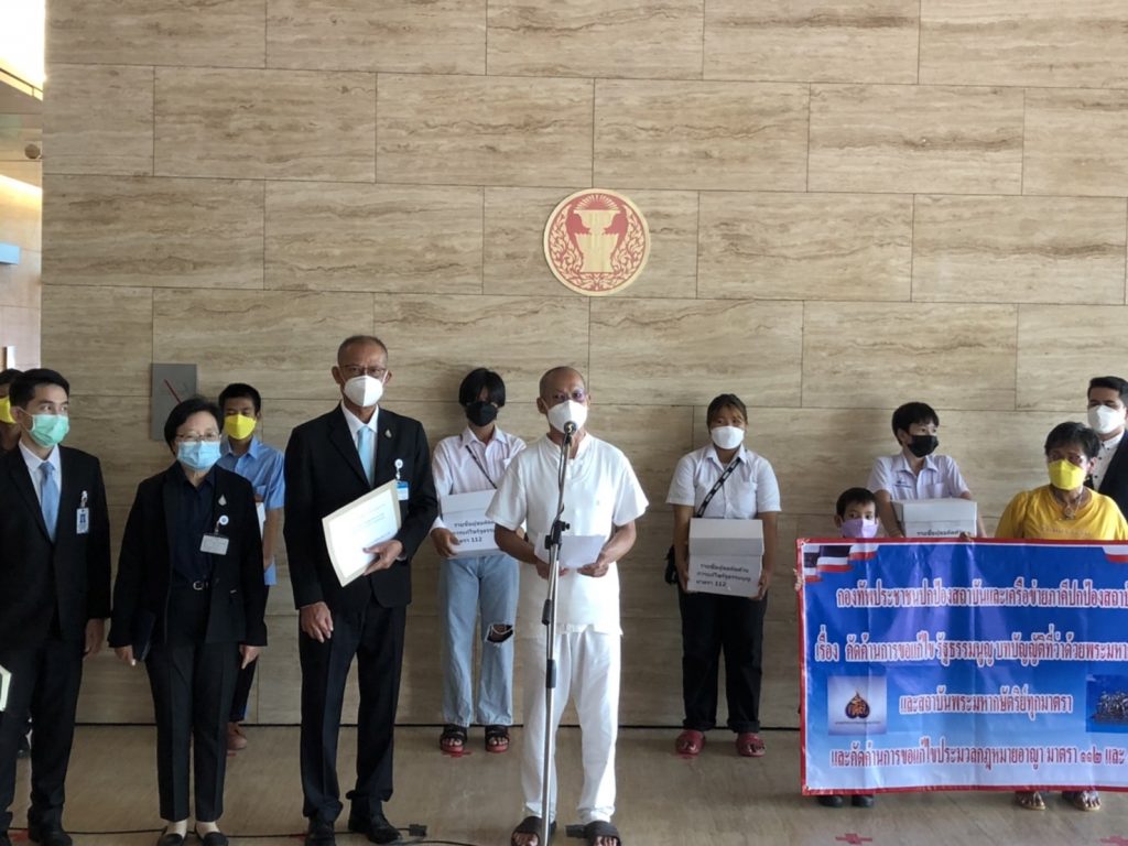 รัฐสภา 5 พ.ย.- ผู้สื่อข่าวรายงานว่า กองทัพประชาชนปกป้องสถาบันและเครือข่ายภาคี นำโดยนายสุวิทย์ ทองประเสริฐ หรือ พุทธะอิสระ ได้รวบรวมรายชื่อผู้คัดค้านการแก้ไขมาตรา 112 และ 116 กว่า 222,928 รายชื่อ เข้ายื่นหนังสือต่อนายชวน หลีกภัย ประธานสภาผู้แทนราษฎร ผ่านนายสมบูรณ์ อุทัยเวียนกุล ที่ปรึกษา เพื่อขอคัดค้านการแก้ไขรัฐธรรมนูญบทบัญญัติที่ว่าด้วยพระมหากษัตริย์และสถาบันพระมหากษัตริย์ทุกมาตราและคัดค้านการแก้ไขประมวลกฎหมายอาญามาตรา 112 และ 116 ด้วย