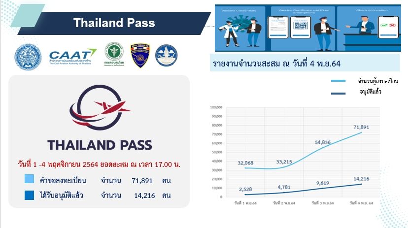 ผู้สื่อข่าวรายงานว่า จากกรณีกรมการกงสุล กระทรวงการต่างประเทศ ยกเลิกระบบการลงทะเบียน เพื่อขอรับหนังสือรับรองการเดินทางเข้าประเทศไทย (Certificate of Entry : COE) ซึ่งได้เริ่มใช้ตั้งแต่เดือนเมษายน 2563 และจะนำระบบใหม่ ที่เรียกว่า Thailand Pass ซึ่งเป็นระบบ web-based มาใช้แทนสำหรับผู้ที่ต้องการเดินทางเข้าประเทศไทยตั้งแต่ 1 พฤศจิกายน 2564 นั้น กรมการกงสุล กระทรวงการต่างประเทศแจ้งว่า ตั้งแต่วันที่ 1-4 พ.ย. มียอดคำขอลงทะเบียน 71,89 1 ราย ได้รับการอนุมัติแล้ว 14,216 ราย ทั้งนี้ คนไทยและชาวต่างชาติที่จะเดินทางเข้าประเทศไทยจะต้องลงทะเบียนในระบบนี้-สำนักข่าวไทย