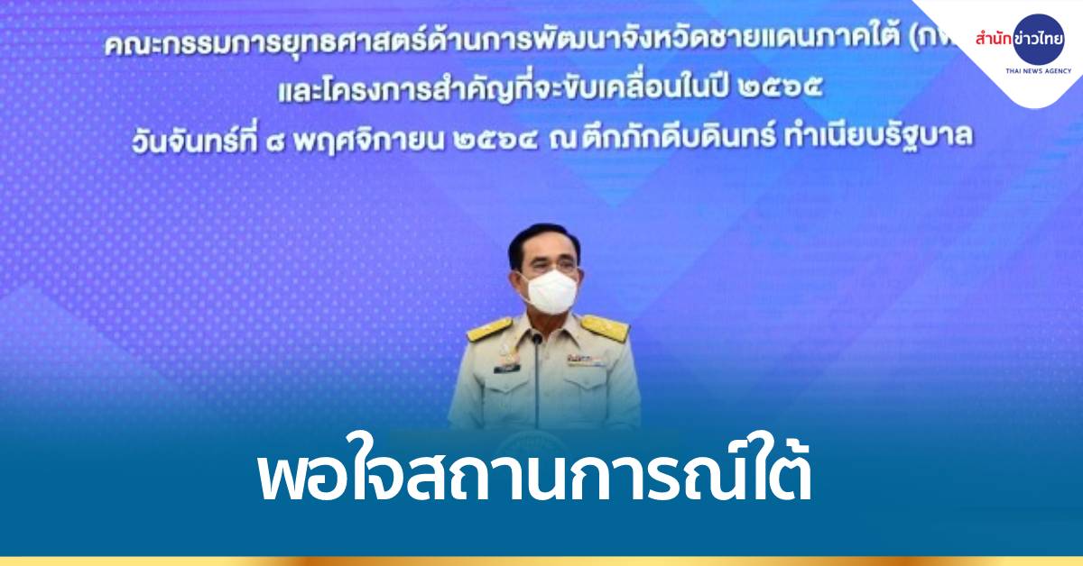 นายกรัฐมนตรี รับฟังผลงานความก้าวหน้าการดำเนินงานตามมติ กพต. ระยะที่ผ่านมา ซึ่งการดำเนินการมีความคืบหน้าและดีขึ้นโดยลำดับ ได้แก่ การช่วยเหลือและพัฒนาแรงงานไทยในพื้นที่จังหวัดชายแดนภาคใต้กลุ่มที่เดินทางกลับจากต่างประเทศภายใต้สถานการณ์โควิด-19 รวมถึงการขับเคลื่อนการใช้ประโยชน์ที่ดินและฟื้นฟูเศรษฐกิจฐานราก ตามแผนปฏิบัติการด้านการบริหารจัดการพลังงานไฟฟ้าแบบครบวงจรในพื้นที่จังหวัดชายแดนใต้เพื่อความมั่นคง มั่งคั่ง ยั่งยืน การพัฒนาศักยภาพด่านศุลกากรชายแดนไทย – มาเลเซีย (9 ด่าน) เพื่อยกระดับการค้าชายแดนและการขับเคลื่อนสภาสันติสุขตำบล จังหวัดชายแดนภาคใต้ผ่านโครงการเสริมสร้างความเข้มแข็งให้กับหมู่บ้านชุมชนและตำบล จังหวัดชายแดนภาคใต้ โดยรัฐบาลสนับสนุนงบประมาณการพัฒนาและเสริมสร้างความเข้มแข็งของประชาชน หมู่บ้านและตำบลตามโครงการตำบลมั่นคง มั่งคั่ง ยั่งยืน ผ่านกลไก “สภาสันติสุขตำบล” เพื่อบริหารจัดการพื้นที่ให้เป็นไปตามปัญหาความจำเป็นและความต้องการของประชาชน รวมทั้งโครงการสำคัญที่จะขับเคลื่อนในปี 2565 ประกอบด้วย 1.กรอบการบูรณาการขับเคลื่อนขจัดความยากจน และพัฒนาคนทุกช่วงวัยอย่างยั่งยืนตามหลักปรัชญาของเศรษฐกิจพอเพียงในพื้นที่จังหวัดชายแดนภาคใต้ภายใต้แนวคิดจัดข้าราชการรับผิดชอบครัวเรือนยากจน 2. โครงการเมืองปศุสัตว์ภายใต้กรอบระเบียงเศรษฐกิจฮาลาลจังหวัดชายแดนภาคใต้ 3. โครงการยกระดับการพัฒนาพื้นที่เมืองต้นแบบเบตง จังหวัดยะลา “Amazean Jungle Trail” และ 4. ดัชนีความเชื่อมั่นด้านเศรษฐกิจ สังคมและความมั่นคงในพื้นที่จังหวัดชายแดนภาคใต้ ไตรมาสที่ 3 (เดือนกรกฎาคม – กันยายน) ปี พ.ศ. 2564 โดยภาพรวมในไตรมาส 3 ดัชนีความเชื่อมั่นจังหวัดชายแดนภาคใต้ ปรับตัวดีขึ้นมาอยู่ที่ระดับ 51.87 เป็นผลจากความเชื่อมั่นด้านเศรษฐกิจและความเชื่อมั่นด้านสังคมที่ปรับตัวดีขึ้น
