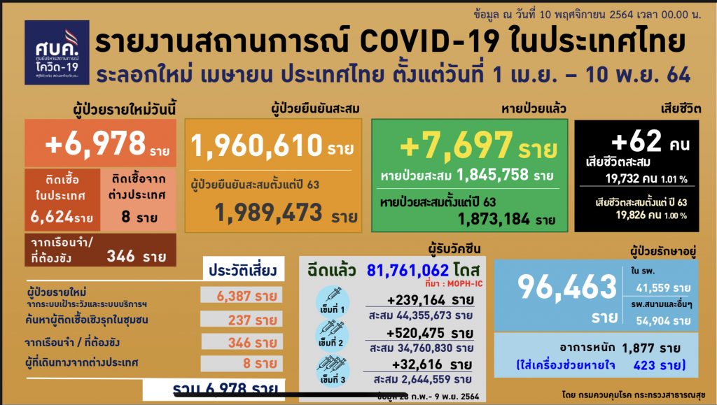 ทำเนียบฯ 10 พ.ย.-ศบค. เผยตัวเลขโควิดในไทย 6,978 ราย เสียชีวิต 62 ราย ชี้แนวโน้มติดเชื้อทั่วประเทศลดลง แต่ยังพบคลัสเตอร์โรงงาน-สถานประกอบการ-งานบวช-งานกฐิน –งานศพ