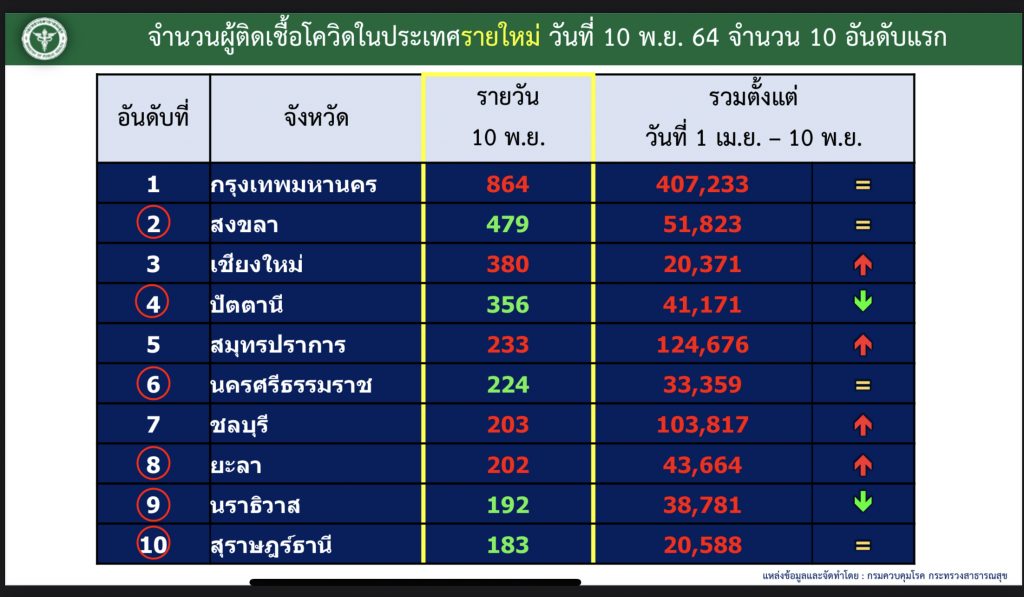 ส่วน 10 อันดับแรก ของจังหวัดที่พบผู้ติดเชื้อโควิด-19 วันที่ 10 พ.ย.2564 ประกอบด้วย กรุงเทพมหานคร 864 ราย สงขลา 479 ราย เชียงไหม่ 380 ราย ปัตตานี 356 ราย สมุทรปราการ 233 ราย นครศรีธรรมราช 224 ราย ชลบุรี 203 ราย ยะลา 202 ราย นราธิวาส 192 ราย และสุราษฎร์ธานี 183 ราย