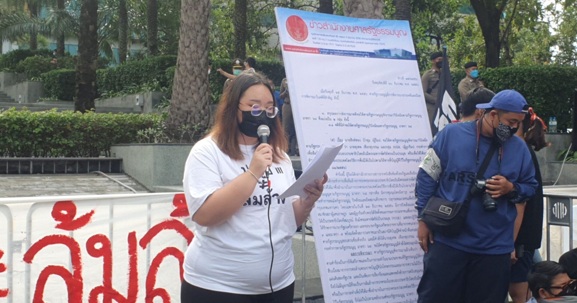 น.ส.ปนัสยา สิทธิจิรวัฒนกุล หรือรุ้ง มาฟังคำวินิจฉัยของศาลรัฐธรรมนูญ ในคดีที่นายณฐพร โตประยูร ขอให้ศาลรัฐธรรมนูญวินิจฉัยตามรัฐธรรมนูญมาตรา 49 ว่าการกระทำของนายอานนท์ นำภา นายภาณุพงศ์ จาดนอก หรือ ไมค์ และน.ส.ปนัสยา ชุมนุมปราศรัยเพื่อเสนอข้อเรียกร้องเป็นการใช้สิทธิหรือเสรีภาพเพื่อล้มล้างการปกครองระบอบประชาธิปไตยอันมีพระมหากษัตริย์ทรงเป็นประมุข ตามรัฐธรรมนูญ มาตรา 49 วรรคหนึ่งหรือไม่