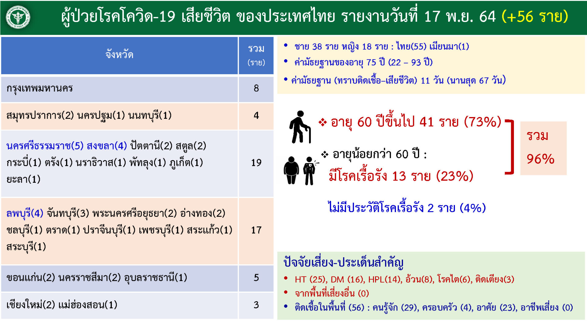 พญ.สุมณี กล่าวว่า ส่วนผู้เสียชีวิต 56 ราย เป็นเพศชาย 38 ราย เพศหญิง 18 ราย อายุเฉลี่ย 75 ปี (22-93 ปี) โดยมีสัดส่วนผู้ที่มีอายุ 60 ปีขึ้นไป 41 ราย คิดเป็น 73% ผู้มีโรคเรื้อรัง 13 ราย คิดเป็น 23% และไม่มีประวัติโรคเรื้อรัง 2 ราย คิดเป็น 4% รวมยอดเสียชีวิตสะสม จำนวน 20,143 ราย