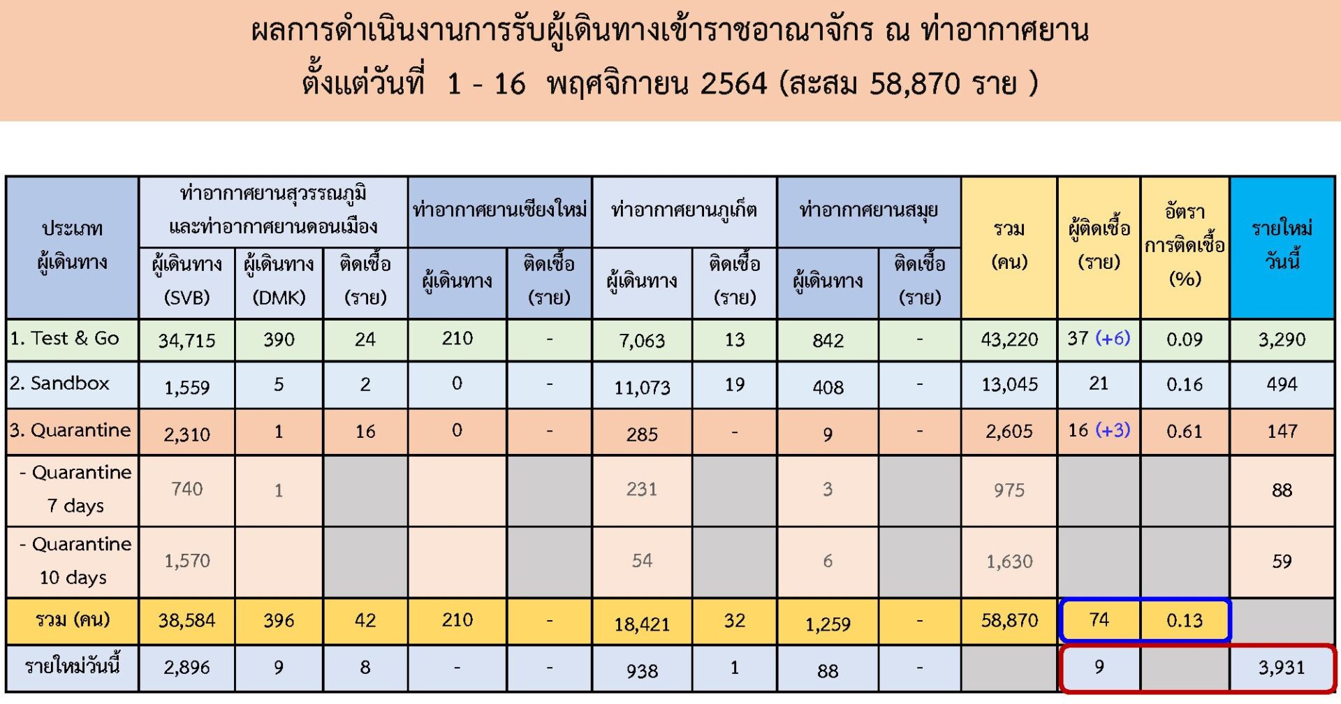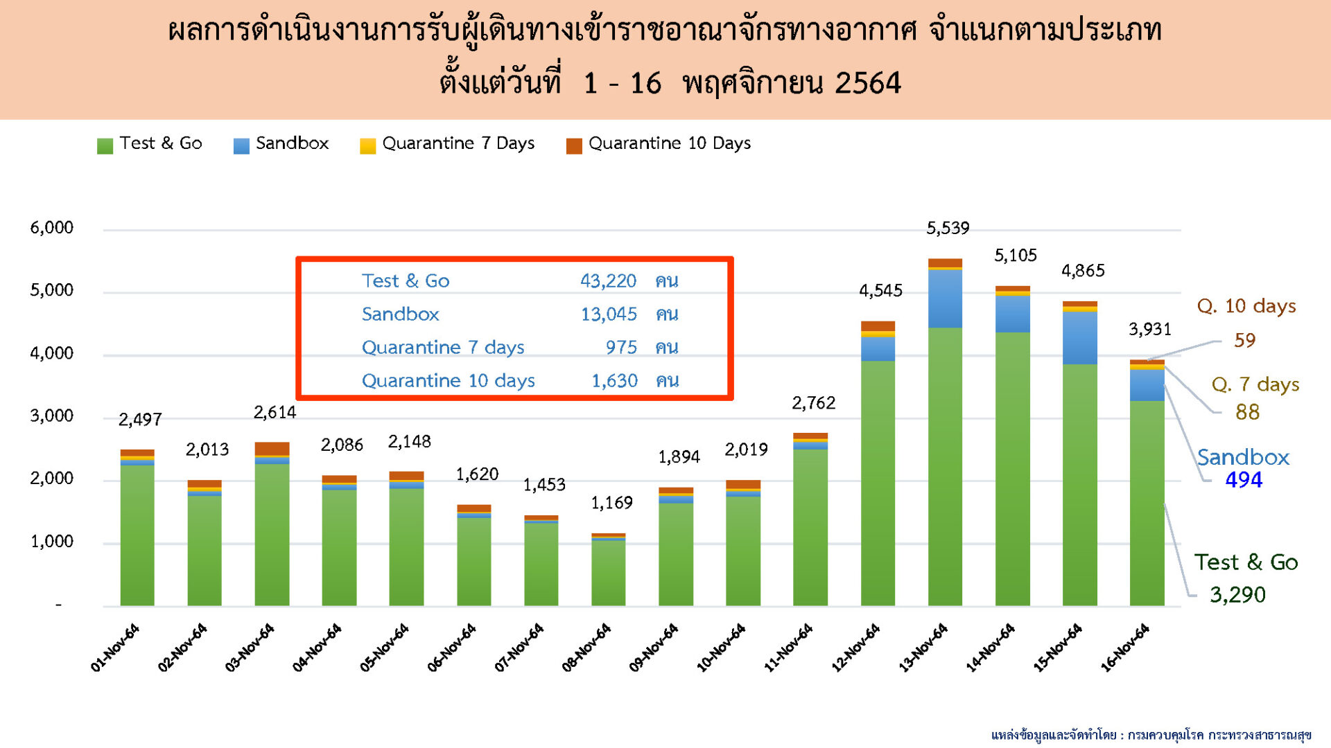 ผู้ช่วยโฆษก ศบค. กล่าวว่า สำหรับจำนวนนักท่องเที่ยวที่เดินทางเข้ามาในราชอาณาจักร วันที่ 16 พ.ย.64 มีจำนวน 3,931 ราย เข้ามาในกลุ่มไม่ต้องกักตัว (Test&Go) 3,290 ราย Sandbox 494 ราย Quarantine 7 วัน 88 ราย และ Quarantine 10 วัน 59 ราย