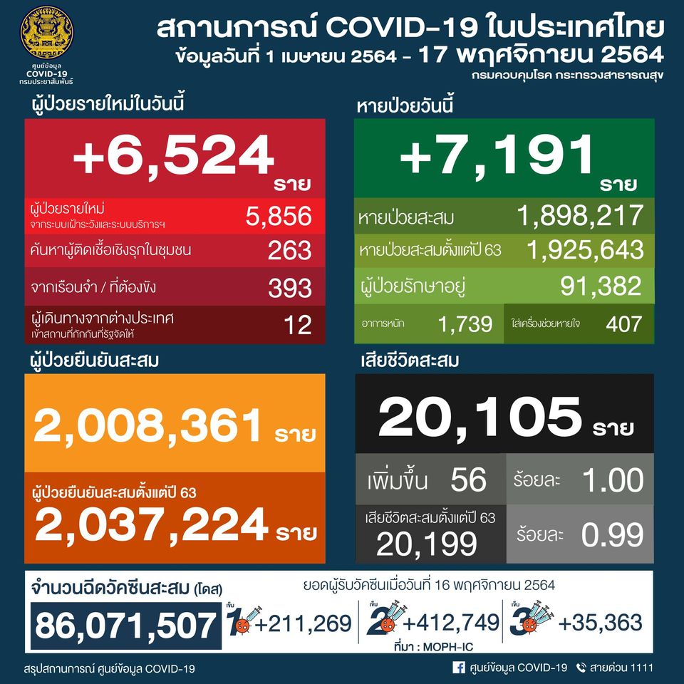 พญ.สุมณี วัชรสินธุ์ ผู้ช่วยรองโฆษกศูนย์บริหารสถานการณ์โควิด-19 (ศบค.) และผู้อำนวยการสำนักสื่อสารความเสี่ยงฯ กรมควบคุมโรค แถลงสถานการณ์โควิด-19 ในประเทศวันนี้ (17 พ.ย.) ว่า ผู้ติดเชื้อรายใหม่ 6,524 ราย ประกอบด้วย ผู้ติดเชื้อในประเทศจากระบบเฝ้าระวังและระบบบริการ 5,856 ราย จากการค้นหาผู้ติดเชื้อเชิงรุกในชุมชน 263 ราย และจากเรือนจำ/ที่ต้องขัง 393 ราย ผู้ที่เดินทางมาจากต่างประเทศและเข้าสถานที่กักกันที่รัฐจัดให้ 12 ราย มาจากสหรัฐอเมริกา ญี่ปุ่น สหราชอาณาจักร อียิปต์ เบลเยียม ประเทศละ 1 ราย กัมพูชา เมียนมา ประเทศละ 2 ราย เยอรมนี 3 ราย