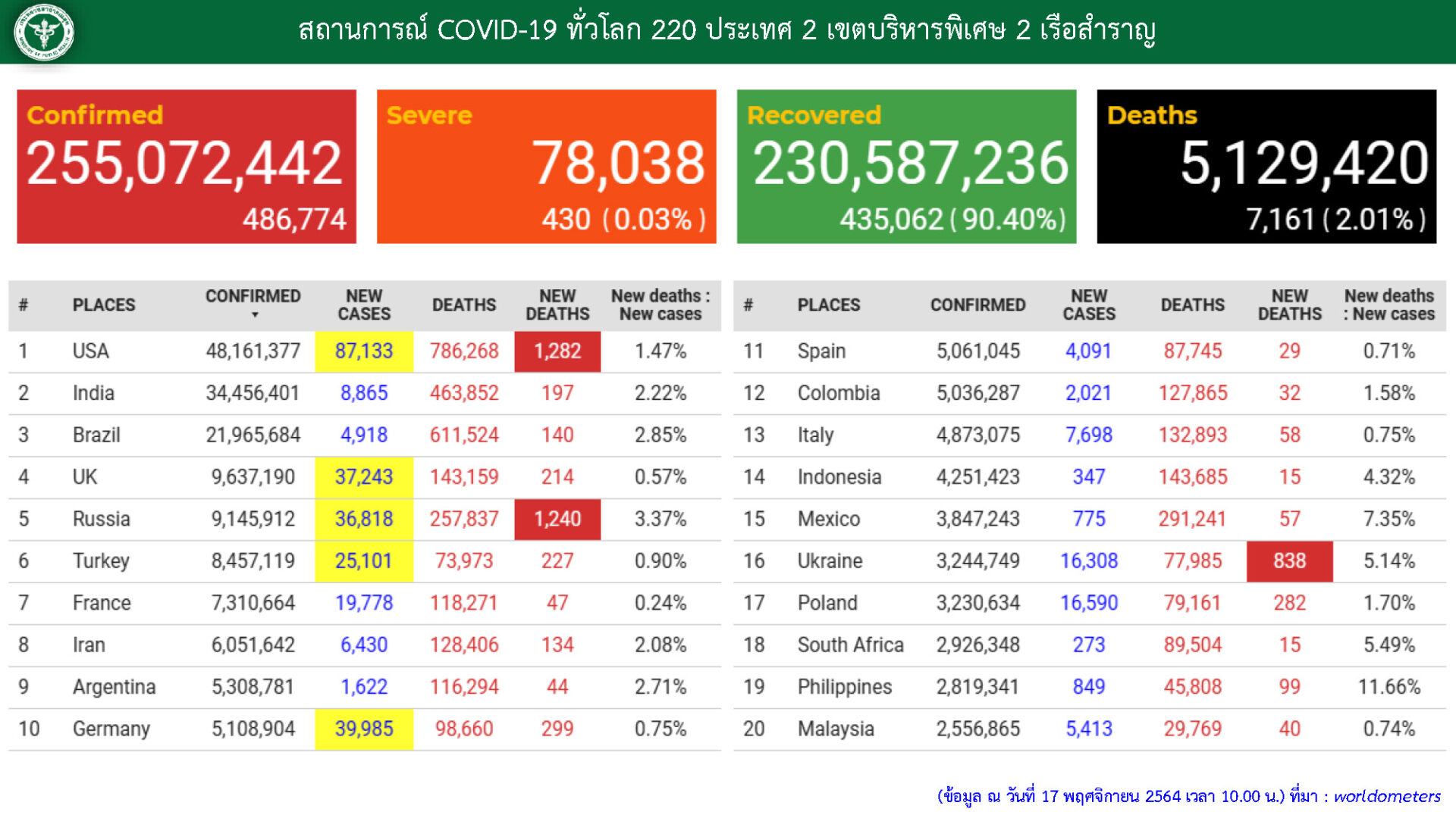 ส่วนสถานการณ์การระบาดของโรคโควิด-19 ทั่วโลก พญ.สุมณี กล่าวว่า ล่าสุดวันนี้ (17 พ.ย.) มียอดผู้ติดเชื้อสะสมรวม 255,072,442 ราย เสียชีวิต 5,129,420 ราย โดยประเทศที่มียอดผู้ติดเชื้อสูงสุด อันดับแรก สหรัฐอเมริกา 48,161,377 ราย ส่วนประเทศไทยมีผู้ติดเชื้อสะสมอยู่ในอันดับที่ 24