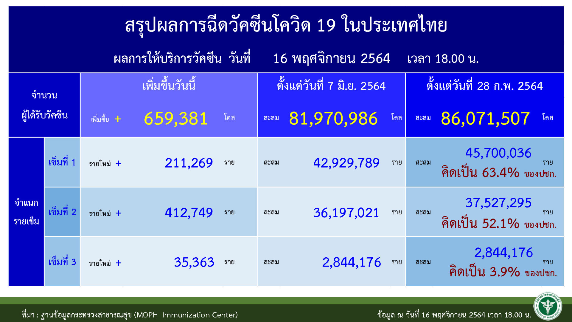 พญ.สุมณี กล่าวว่า สำหรับการฉีดวัคซีนโควิด-19 สรุปการได้รับวัคซีนสะสม ตั้งแต่วันที่ 28 ก.พ.-16 พ.ย.64 รวม 86,071,507 แบ่งเป็น ผู้ได้รับวัคซีน เข็มที่ 1 จำนวน 45,700,036 ราย เข็มที่ 2 จำนวน 37,527,295 ราย และเข็มที่ 3 จำนวน 2,844,176 ราย ทั้งนี้ จากการสำรวจยังพบว่ามีผู้ที่ยังไม่ได้รับการฉีดวัคซีนกว่า 11 ล้านคน จึงขอความร่วมมือผู้นำชุมชนช่วยกันเร่งรัดการฉีดวัคซีนในพื้นที่ให้มากขึ้น โดยเฉพาะจังหวัดที่ยังพบการระบาด