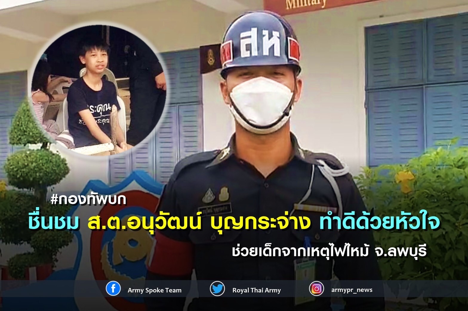 กองทัพบก 23 พ.ย. – ทบ. เตรียมมอบประกาศเกียรติคุณ “ส.ต.อนุวัฒน์ บุญกระจ่าง” สารวัตรทหารที่ช่วยเด็ก 8 ขวบ จากเหตุไฟไหม้ จ.ลพบุรี “ชื่นชมทำดีด้วยหัวใจ”