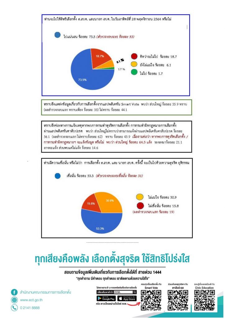 สำนักงานคณะกรรมการการเลือกตั้ง โดยสถาบันพัฒนาการเมืองและการเลือกตั้ง ร่วมกับนักศึกษาหลักสูตรการพัฒนาการเมืองและการเลือกตั้งระดับสูง รุ่นที่ 12 ( พตส.12) ออกสำรวจความเห็นของผู้มีสิทธิเลือกตั้ง อบต. ระหว่างวันที่ 6-14 พฤศจิกายน 2564 ในพื้นที่ 42 จังหวัด จำนวน 1,500 ตัวอย่าง มีผลสำรวจที่สำคัญดังนี้ การรับรู้ข้อมูลข่าวสารเกี่ยวกับการเลือกตั้ง ทราบว่ามีการเลือกตั้งสมาชิกสภาและนายกองค์การบริหารส่วนตำบล ( อบต.) ในวันอาทิตย์ที่ 28 พฤศจิกายน ร้อยละ 92.8 ไม่ทราบร้อยละ 7.2 โดยสื่อที่ทำให้รับรู้ข้อมูลข่าวสารเกี่ยวกับการเลือกตั้งมากที่สุด 3 ลำดับแรก คือป้ายประชาสัมพันธ์เชิญชวน ร้อยละ 51.7 รถประชาสัมพันธ์ของผู้สมัครรับเลือกตั้ง ร้อยละ 42.7 หอกระจายข่าวประจำหมู่บ้าน ร้อยละ 38.8