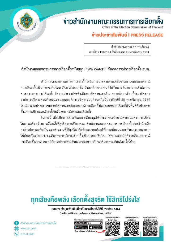 สำนักงานคณะกรรมการการเลือกตั้ง เผยแพร่เอกสารข่าวว่า ได้รับการประสานจากเครือข่ายเยาวชนสังเกตการณ์การเลือกตั้งเพื่อประชาธิปไตย (We Watch) ซึ่งเป็นองค์กรเอกชนที่ได้รับการรับรองจากสำนักงาน กกต. มีความประสงค์จะดำเนินการติดตามและสังเกตการณ์การเลือกตั้งสมาชิกสภาองค์การบริหารส่วนตำบลและนายกองค์การบริหารส่วนตำบล ในวันอาทิตย์ที่ 28 พฤศจิกายน 2564 นี้ โดยมีอาสาสมัครเยาวชนร่วมติดตามและสังเกตการณ์การเลือกตั้งโดยรอบหน่วยเลือกตั้ง ในพื้นที่ทั่วประเทศ ตั้งแต่การเปิดหน่วยเลือกตั้งจนสิ้นสุดการนับคะแนนเลือกตั้ง เพื่อเป็นการส่งเสริมและสนับสนุนให้ประชาชนเข้ามามีส่วนร่วมทางการเมือง ในการเสริมสร้างการเลือกตั้งที่สุจริตและเที่ยงธรรม สำนักงาน กกต.ประจำจังหวัด องค์กรปกครองท้องถิ่น และส่วนงานที่เกี่ยวข้องได้เตรียมความพร้อมให้การสนับสนุนและอำนวยความสะดวกให้กับเครือข่ายเยาวชนสังเกตการณ์การเลือกตั้งเพื่อประชาธิปไตย (We Watch) ได้ร่วมสังเกตการณ์การเลือกตั้งสมาชิกสภาองค์การบริหารส่วนตำบลและนายกองค์การบริหารส่วนตำบลในครั้งนี้ด้วย.-สำนักข่าวไทย.
