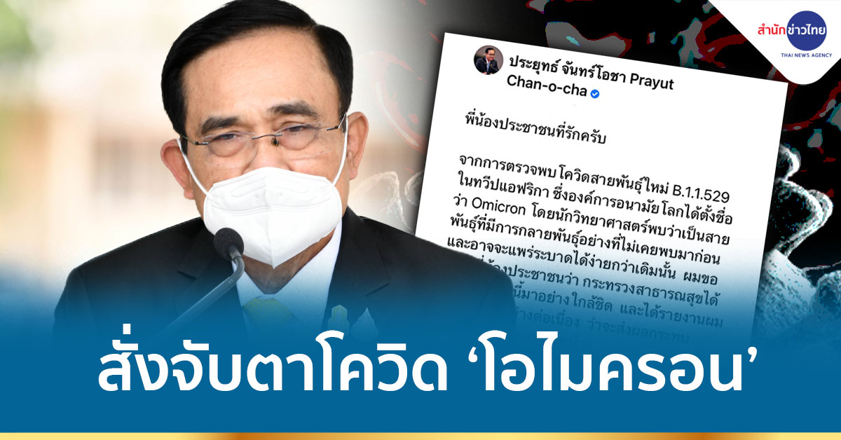 พล.อ.ประยุทธ์ จันทร์โอชา นายกรัฐมนตรีและรัฐมนตรีว่าการกระทรวงกลาโหม โพสต์ข้อความผ่านเฟซบุ๊กส่วนตัว ถึงกรณีการตรวจพบโควิดสายพันธุ์ใหม่ B.1.1.529 ในทวีปแอฟริกา ซึ่งองค์การอนามัยโลกได้ตั้งชื่อว่า Omicron โดยตนเองได้สั่งการให้หน่วยงานที่เกี่ยวข้อง ทั้งกระทรวงสาธารณสุข กระทรวงการต่างประเทศ กระทรวงการท่องเที่ยวและกีฬารวมทั้งหน่วยงานคัดกรองที่จุดต่างๆ ให้จับตามองและให้ความสำคัญกับเรื่องนี้เป็นพิเศษ และรายงานข้อมูลในทันทีที่มีความคืบหน้า หรือมีข้อเสนอแนะด้านมาตรการต่างๆ ซึ่งหากมีความจำเป็นเร่งด่วนที่จะต้องมีการปรับมาตรการโดยเฉพาะการเดินทางเข้าออกประเทศ จากประเทศต่างๆ ที่มีการพบผู้ติดเชื้อโควิดสายพันธุ์ใหม่นี้ ตนเองสั่งการให้ดำเนินการโดยทันที โดยคำนึงถึงความปลอดภัยของประชาชนสูงสุด