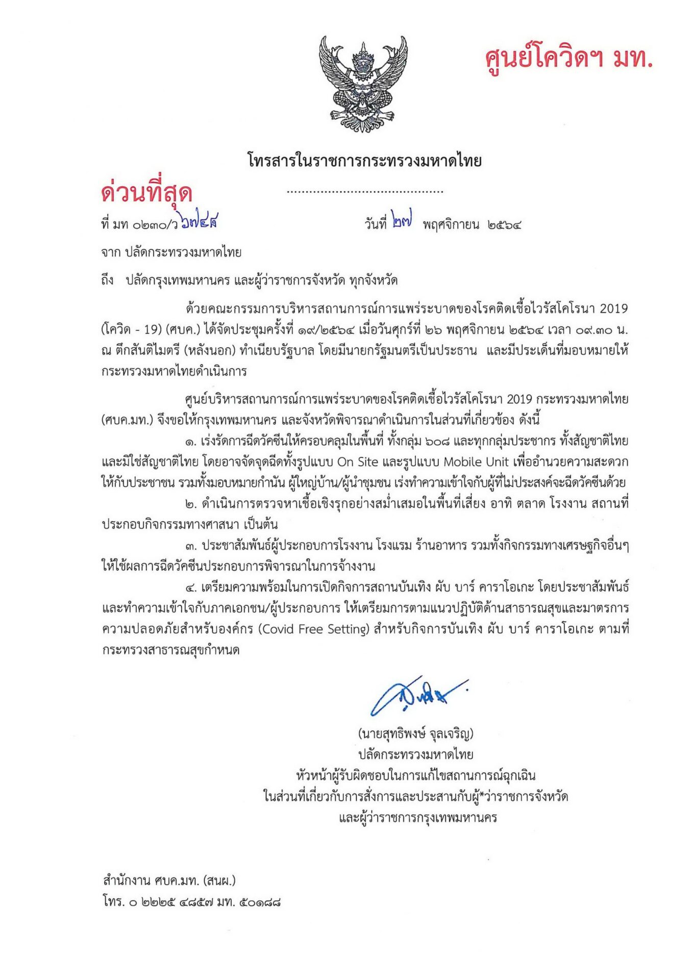 วันนี้ (28 พ.ย.64) นายสุทธิพงษ์ จุลเจริญ ปลัดกระทรวงมหาดไทย หัวหน้าผู้รับผิดชอบในการแก้ไขสถานการณ์ฉุกเฉินในส่วนที่เกี่ยวกับการสั่งการและประสานกับผู้ว่าราชการจังหวัดและผู้ว่าราชการกรุงเทพมหานคร เปิดเผยว่า ในการประชุมคณะกรรมการบริหารสถานการณ์การแพร่ระบาดของโรคติดเชื้อไวรัสโคโรนา 2019 (โควิด-19) (ศบค.) เมื่อวันศุกร์ที่ 26 พ.ย.64 ซึ่งมี พล.อ.ประยุทธ์ จันทร์โอชา นายกรัฐมนตรีและรัฐมนตรีว่าการกระทรวงกลาโหม เป็นประธานการประชุม ได้มีมติมอบหมายให้กระทรวงมหาดไทยประสานการปฏิบัติกับทุกจังหวัดและกรุงเทพมหานคร เกี่ยวกับมาตรการในการสกัดกั้นการแพร่ระบาดของโรคโควิด-19