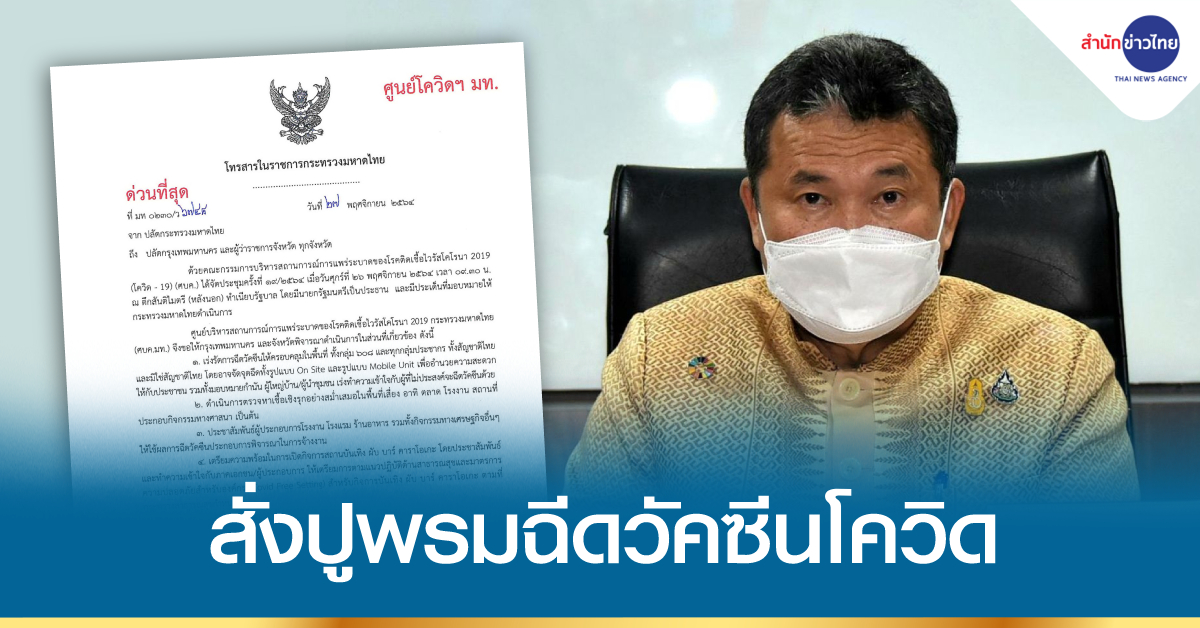 กรุงเทพฯ 28 พ.ย. – มหาดไทยสั่งการผู้ว่าฯ ทั่วประเทศ และ กทม. เร่งรัดปูพรมฉีดวัคซีนป้องกันโควิด-19 ทุกพื้นที่ พร้อมสร้างการรับรู้สถานประกอบการปฏิบัติตามมาตรการความปลอดภัยสำหรับองค์กร กิจการบันเทิง ผับ บาร์ คาราโอเกะ ตามที่ ก.สาธารณสุข กำหนดอย่างเคร่งครัด