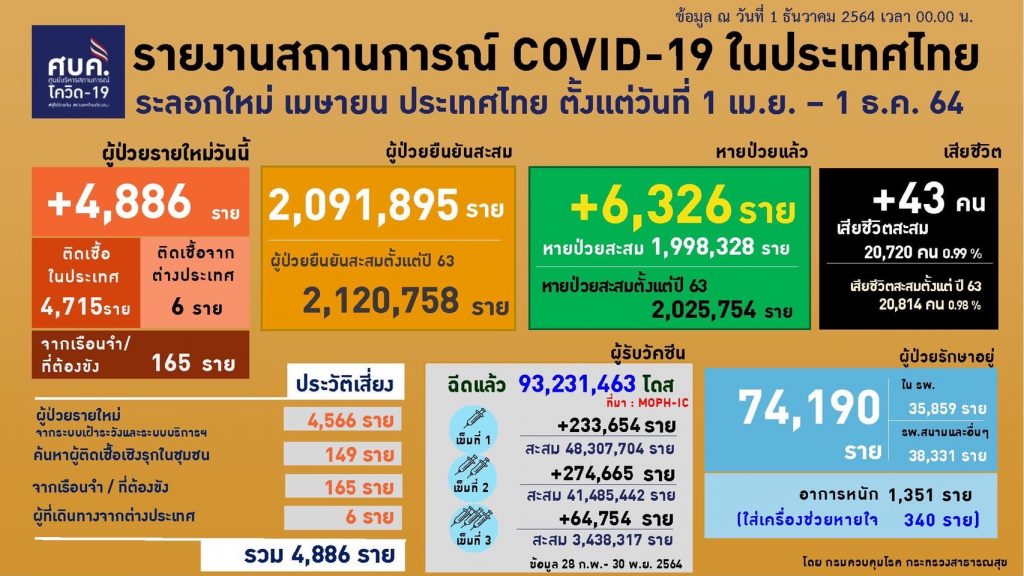 นพ.ทวีศิลป์ วิษณุโยธิน โฆษกศูนย์บริหารสถานการณ์โควิด- 19 (ศบค.) แถลงสถานการณ์ ประจำวันศุกร์ที่ 1 ธันวาคม 2564 ว่า ขณะนี้ทั่วโลกมีผู้ติดเชื้อโควิด-19 แล้วกว่า 263 ล้านคน เพิ่มขึ้นในวันเดียว 585,319 คน โดย สหรัฐอเมริกา เป็นอันดับที่หนึ่งที่มีผู้ติดเชื้อในวันเดียวถึง 106,876 ราย รองลงมาที่เยอรมันนี 55,880 ราย ขณะที่เวียดนามมีผู้ติดเชื้อ 13,972 ราย โดยประเทศไทยมีการติดเชื้อรายใหม่ 4,886 ราย รวมผู้ป่วยสะสม ตั้งแต่วันที่ 1 เมษายน 2564 รวม 2,091,895 ราย หายป่วยกลับบ้านวันนี้ 6,326 ราย และป่วยอาการหนัก 1,351 ใส่เครื่องช่วยหายใจ 340 ราย เสียชีวิต 43 คน