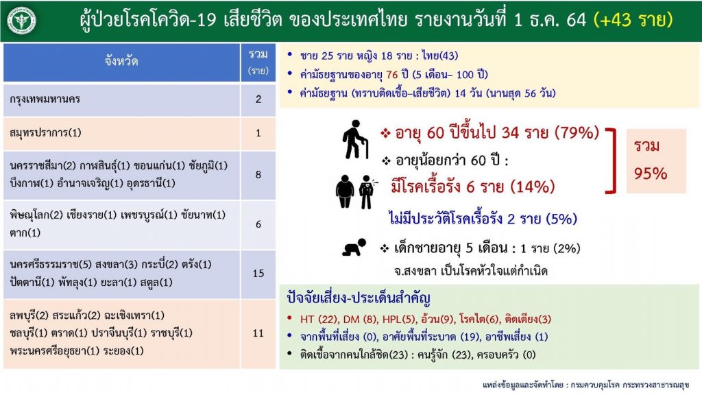 สำหรับรายละเอียดผู้เสีย 43 คน ชีวิตประกอบด้วยชาย 25 รายหญิง 18 รายและ 95% ยังคงเป็นกลุ่มคนอายุ 60 ปีขึ้นไปและผู้ป่วยเรื้อรัง