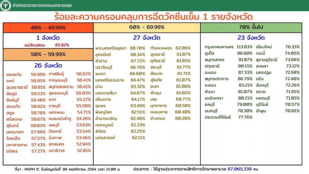 ขณะเดียวกันยังมีอีก 26 จังหวัดที่พบว่า ตัวเลขการฉีดวัคซีนยังอยู่ในระหว่าง 50% ถึง 59.99% ประกอบด้วย จังหวัดขอนแก่น แพร่ อุบลราชธานี ชัยภูมิ สิงห์บุรี สระแก้ว สตูล ศรีสะเกษ สุรินทร์ นครนายก ร้อยเอ็ด มหาสารคาม ยโสธร กาฬสินธุ์ กาญจนบุรี สมุทรสงคราม สุพรรณบุรี ตากราชบุรี นครพนม หนองบัวลำภูลพบุรี ปัตตานี บึงกาฬ สกลนครและนราธิวาส .-สำนักข่าวไทย.