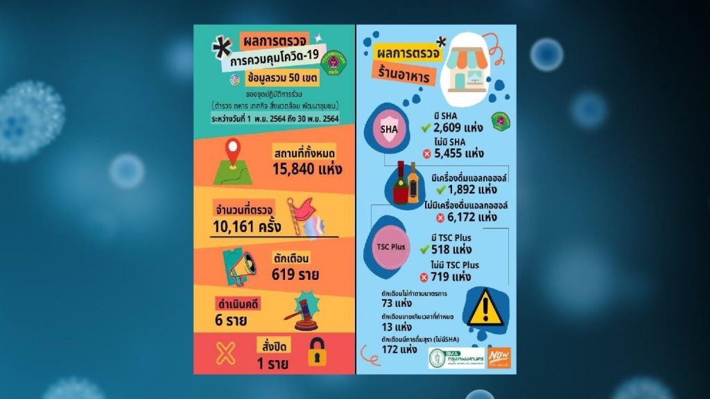 นพ.ทวีศิลป์ วิษณุโยธิน โฆษกศูนย์บริหารสถานการณ์โควิด-19 (ศบค.) กล่าวถึงภาพรวมการที่สถานบริการต่างๆ เรียกร้องขอเปิดให้บริการว่า ปัจจัยหนึ่งที่จะมีผลต่อการพิจารณา คือ เรื่องของมาตรฐาน SHA และ SHA+ ซึ่งภาพรวมโดยเฉพาะของกรุงเทพมหานคร จากการตรวจระหว่างวันที่ 1-30 พฤศจิกายน 2564 ในสถานที่ทั้งหมด 15,840 แห่ง พบว่ามีสถานบริการที่ได้รับมาตรฐาน SHA ประเภทร้านอาหารเพียง 2,609 แห่ง และไม่ได้มาตรฐาน SHA ถึง 5,455 แห่ง ในจำนวนนี้เป็นร้านที่มีเครื่องดื่มแอลกอฮอล์ 1,892 แห่ง ได้มาตรฐาน และเป็นร้านที่ไม่มีเครื่องดื่มแอลกอฮอล์ 6,172 แห่ง เฉพาะเมื่อวานนี้ (30 พ.ย.) ตรวจพบร้านที่จำหน่ายสุราโดยไม่ได้รับมาตรฐาน SHA จำนวน 172 แห่ง โดยได้ตักเตือนแล้ว