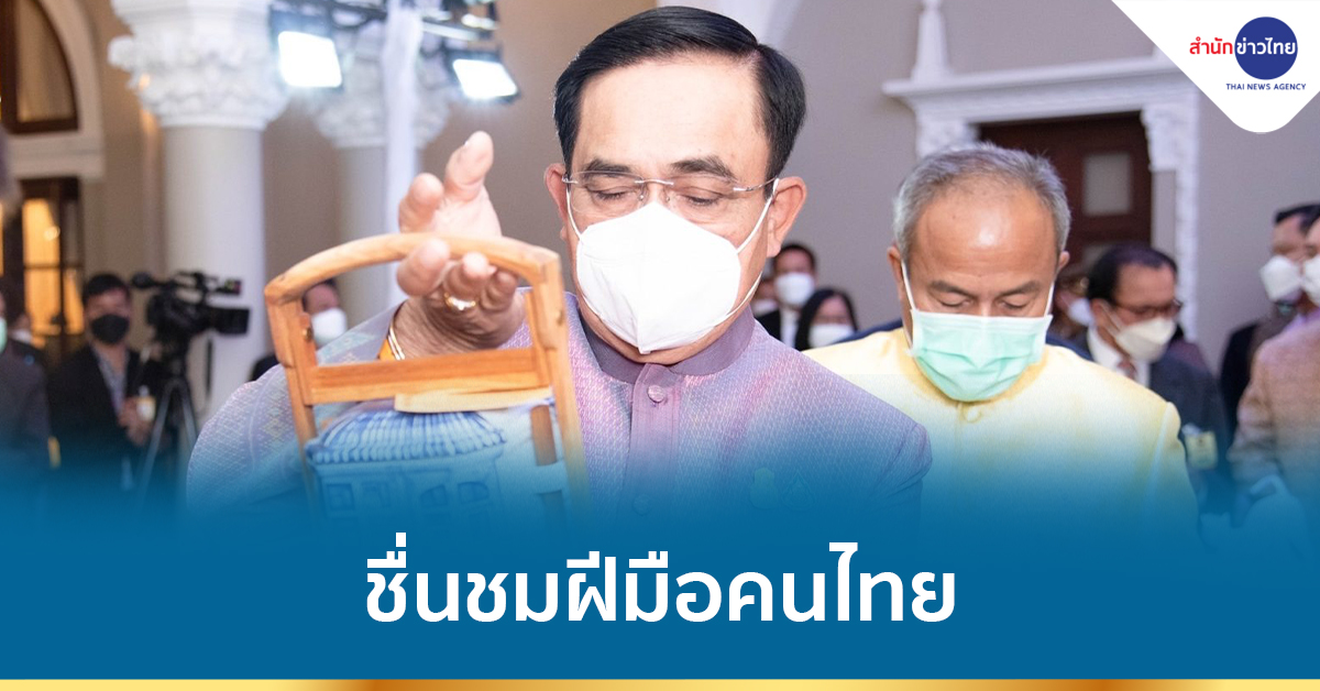 นายกรัฐมนตรี ให้ความสนใจผลิตภัณฑ์ฝีมือคนไทย พร้อมสอบถามถึงวิธีการผลิต แรงบันดาลใจการออกแบบลวดลาย พร้อมชื่นชมการใช้ความคิดสร้างสรรค์เพื่อต่อยอดผลิตภัณฑ์ให้มีมูลค่า