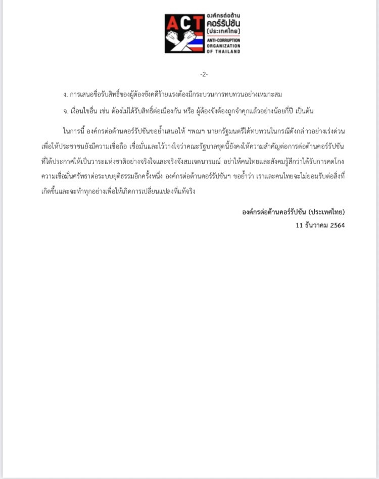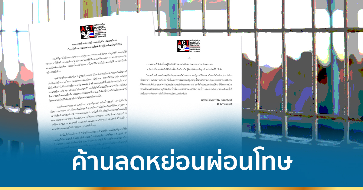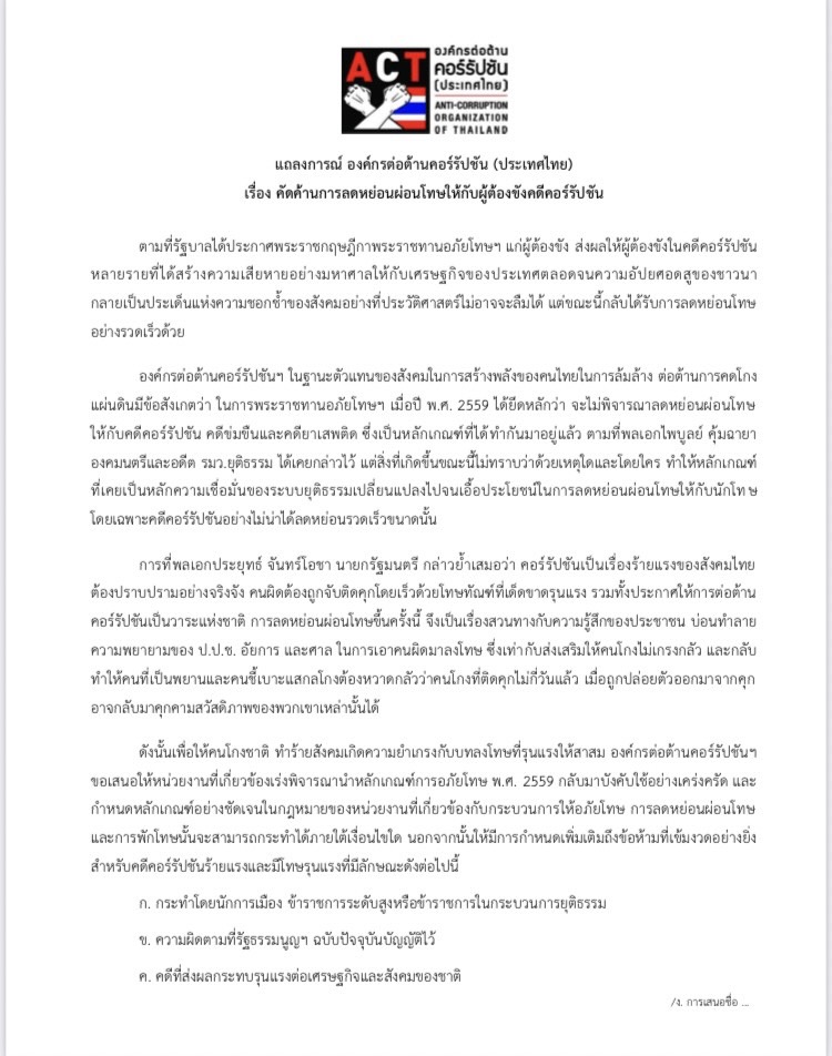 เมื่อวันที่ 11 ธันวาคม 2564 องค์กรต่อต้านคอร์รัปชัน (ประเทศไทย) หรือ ACT ได้ออกแถลงการณ์ เรื่อง คัดค้านการลดหย่อนผ่อนโทษให้กับผู้ต้องขังคดีคอร์รัปชัน โดยเนื้อหาในแถลงการณ์ ระบุว่า ตามที่รัฐบาลได้ประกาศพระราชกฤษฎีกาพระราชทานอภัยโทษฯ แก่ผู้ต้องขัง ส่งผลให้ผู้ต้องขังในคดีคอร์รัปชันหลายรายที่ได้สร้างความเสียหายอย่างมหาศาลให้กับเศรษฐกิจของประเทศตลอดจนความอัปยศอดสูของชาวนา กลายเป็นประเด็นแห่งความชอกช้ำของสังคมอย่างที่ประวัติศาสตร์ไม่อาจจะลืมได้ แต่ขณะนี้กลับได้รับการลดหย่อนโทษอย่างรวดเร็วด้วย
