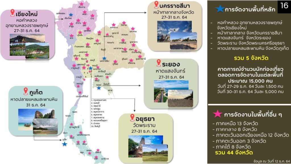 นพ.ทวีศิลป์ กล่าวว่า ที่ประชุมศบค.รับทราบกิจกรรมปีใหม่ที่การท่องเที่ยวแห่งประเทศไทย(ททท .) เสนอจัดในทุกภูมิภาคจำนวน 5 จังหวัด โดยมีพื้นที่จัดงานหลักได้แก่ หอคำหลวง อุทยานหลวงราชพฤกษ์ จังหวัดเชียงใหม่ บริเวณหน้าศาลากลาง จังหวัดนครราชสีมา หาดแสงจันทร์ จังหวัดระยอง วัดพระราม จังหวัดพระนครศรีอยธยา หาดปลายแหลมสะพานหิน จังหวัดภูเก็ต นอกจากนี้ ยังจัดงานในพื้นที่อื่น ๆ ภาคเหนือ 13 จังหวัด ภาคกลาง 8 จังหวัด ภาคตะวันออกเฉียงเหนือ 12 จังหวัดภาคตะวันออก 3 จังหวัดภาคใต้ 8 จังหวัดรวม 44 จังหวัดด้วย